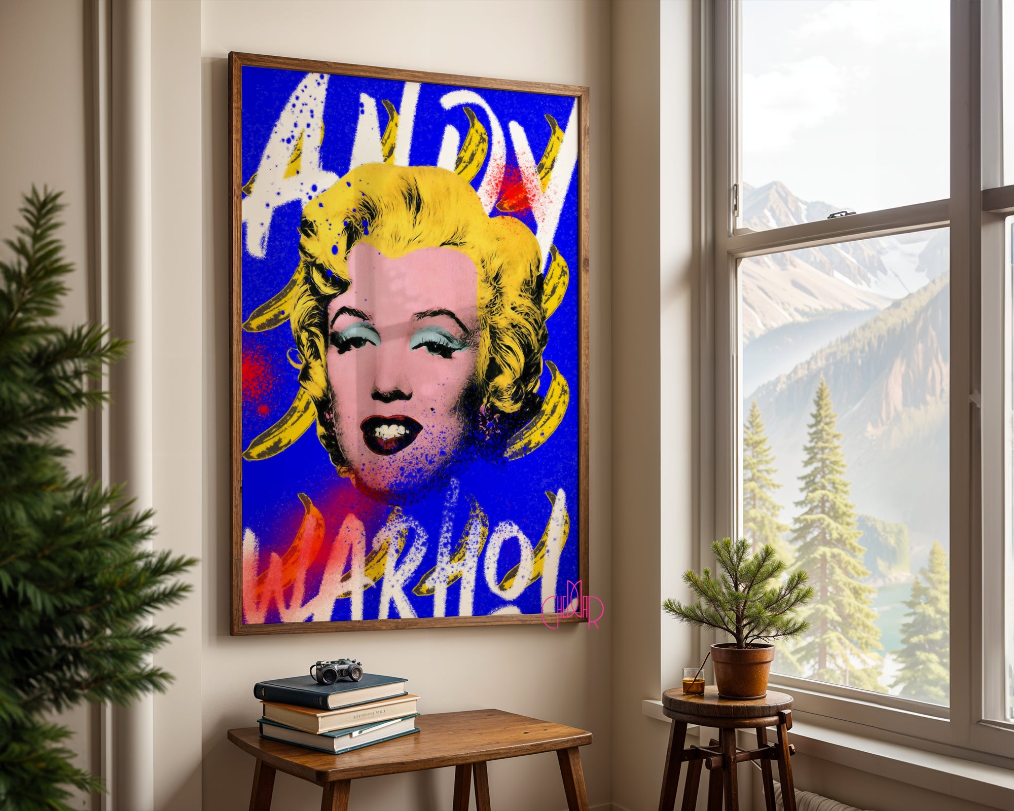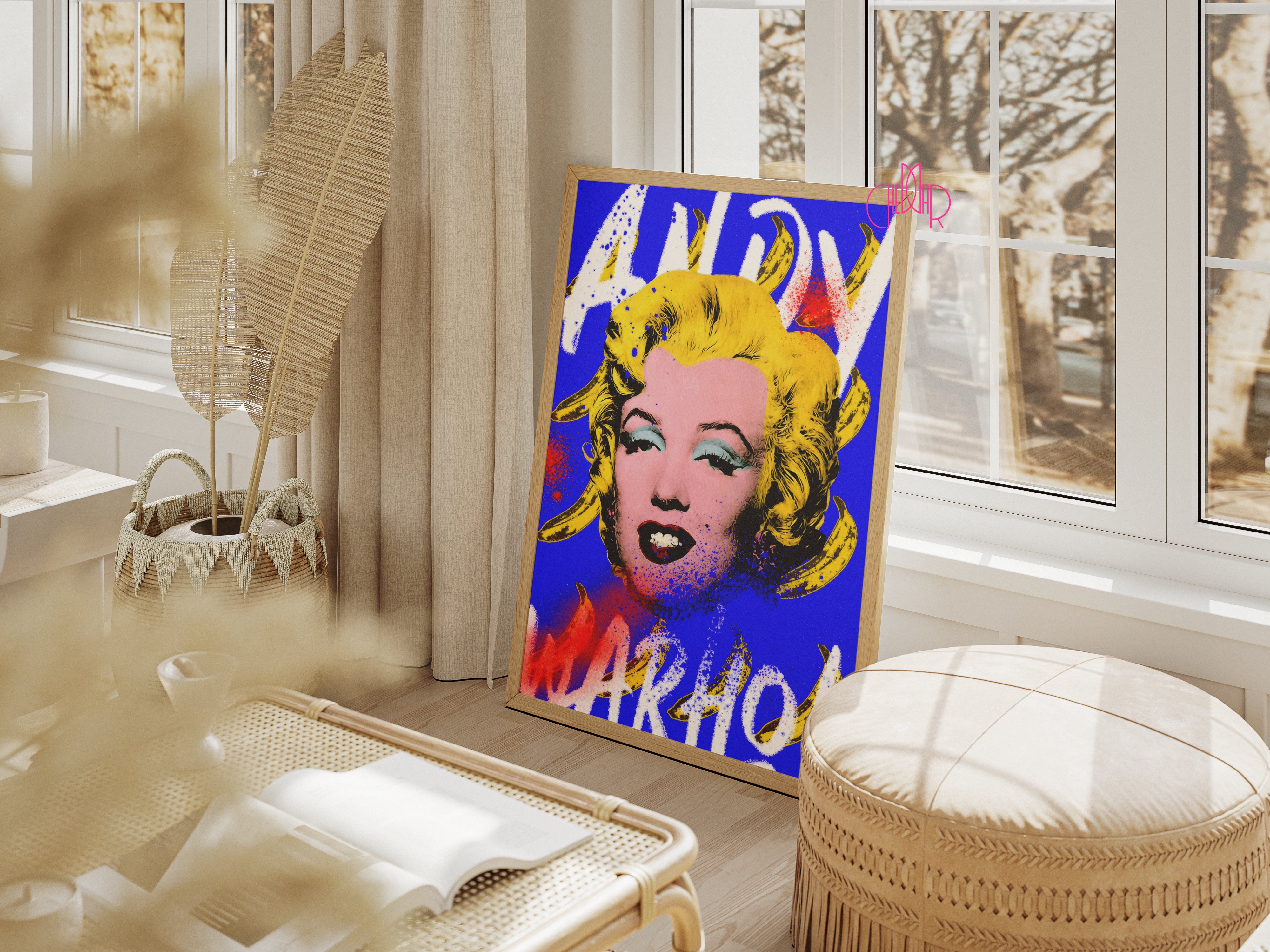 Gdy ikona spotyka uliczny bunt Ten projekt to wizualna eksplozja, która celebruje dziedzictwo Warhola, nadając mu zupełnie nowy, drapieżny charakter. Centralny portret Marilyn Monroe – zaczerpnięty z najsłynniejszej serii artysty – został zestawiony z motywem bananów (nawiązanie do okładki albumu The Velvet Underground & Nico) oraz surową, białą typografią wykonaną w stylu graffiti. Intensywny niebieski kolor tła (Electric Blue) w połączeniu z czerwonymi i żółtymi akcentami sprawia, że praca emanuje pewnością siebie i artystyczną wolnością.