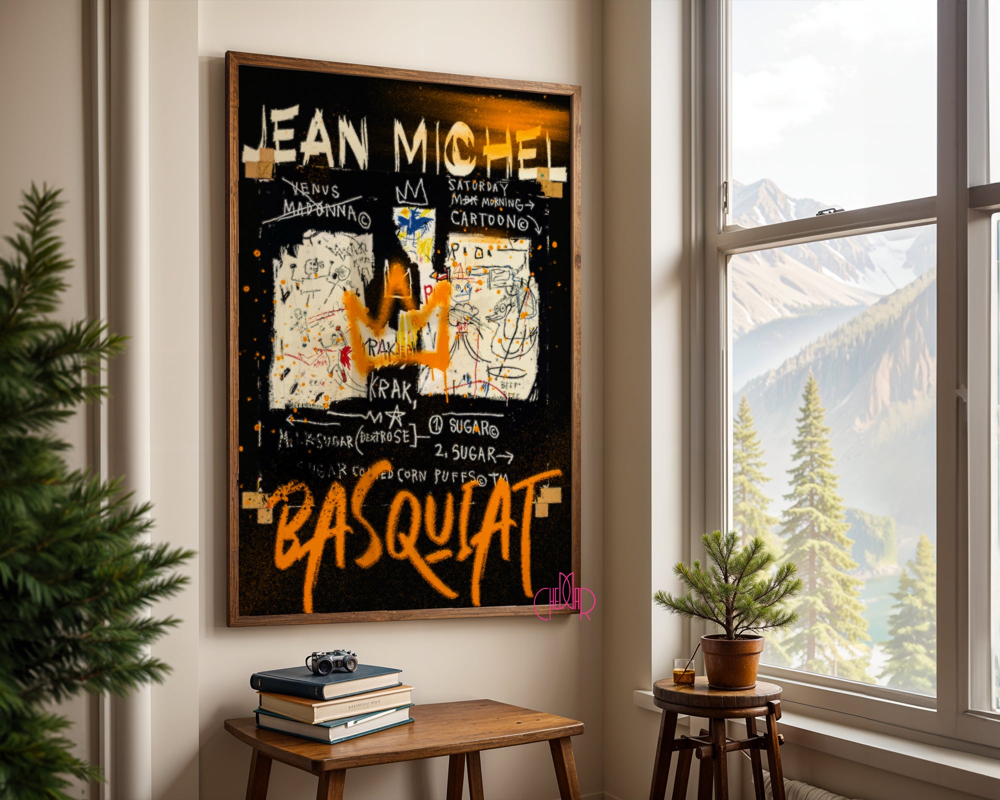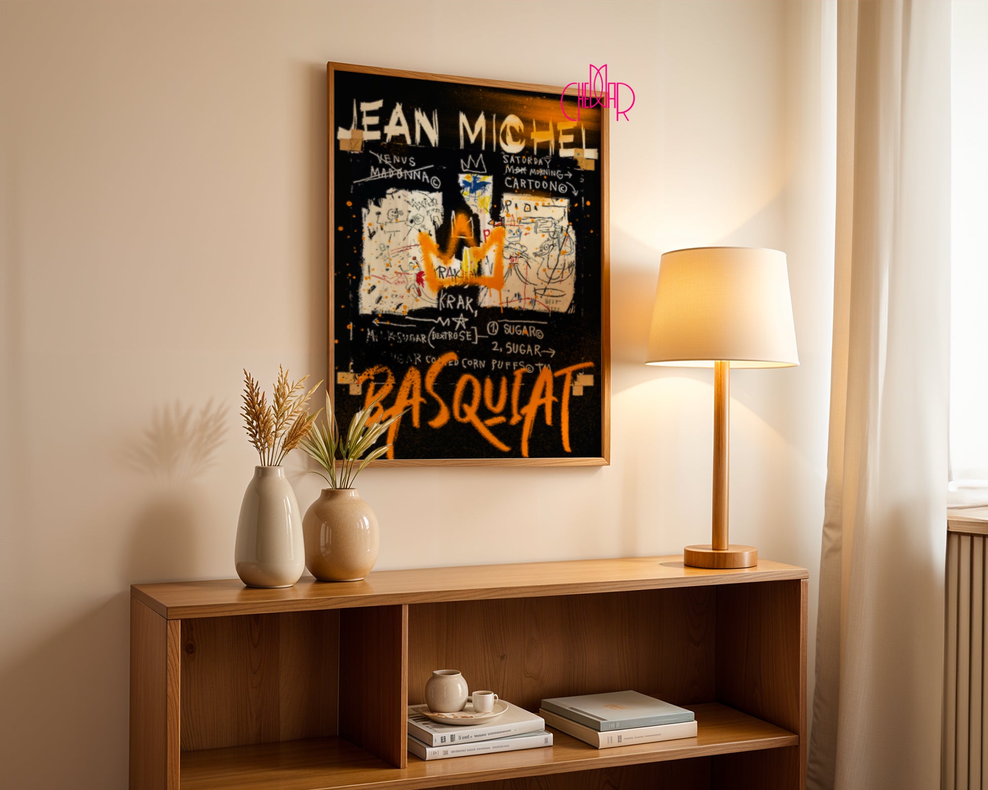 Kontrastowa Paleta: Głęboka czerń tła sprawia, że białe szkice i neonowe, pomarańczowe akcenty napisu "BASQUIAT" stają się niezwykle dynamiczne.