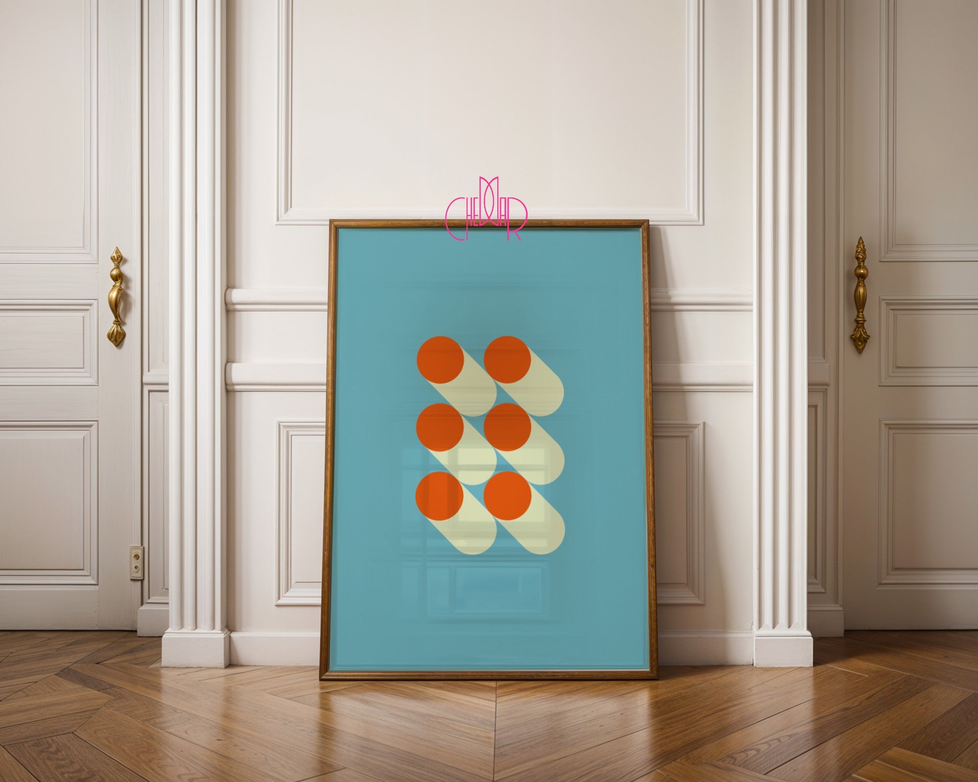 Plakat inspirowany stylem Bauhaus, łączący geometryczne formy, harmonijne kolory i minimalistyczny design. To dekoracja, która dodaje wnętrzu nowoczesnego charakteru i inspiruje, idealna do domu, biura, kawiarni czy przestrzeni kreatywnych.
