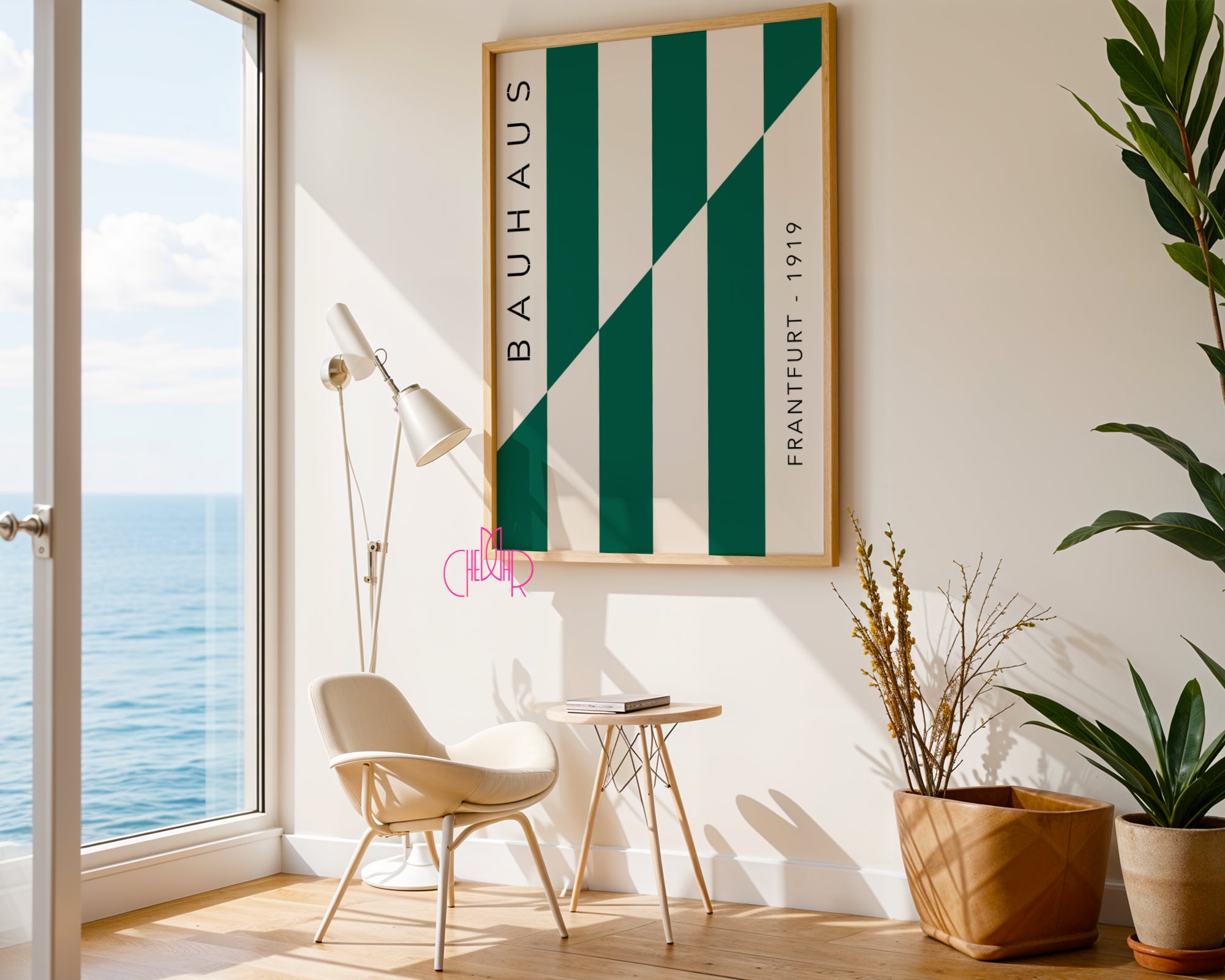 Minimalistyczny plakat Bauhaus Frankfurt 1919, inspirowany klasycznym modernizmem i geometrią szkoły Bauhausu. Proste formy, kontrastowe pasy i ponadczasowa kolorystyka tworzą elegancką dekorację ścienną do nowoczesnych wnętrz.