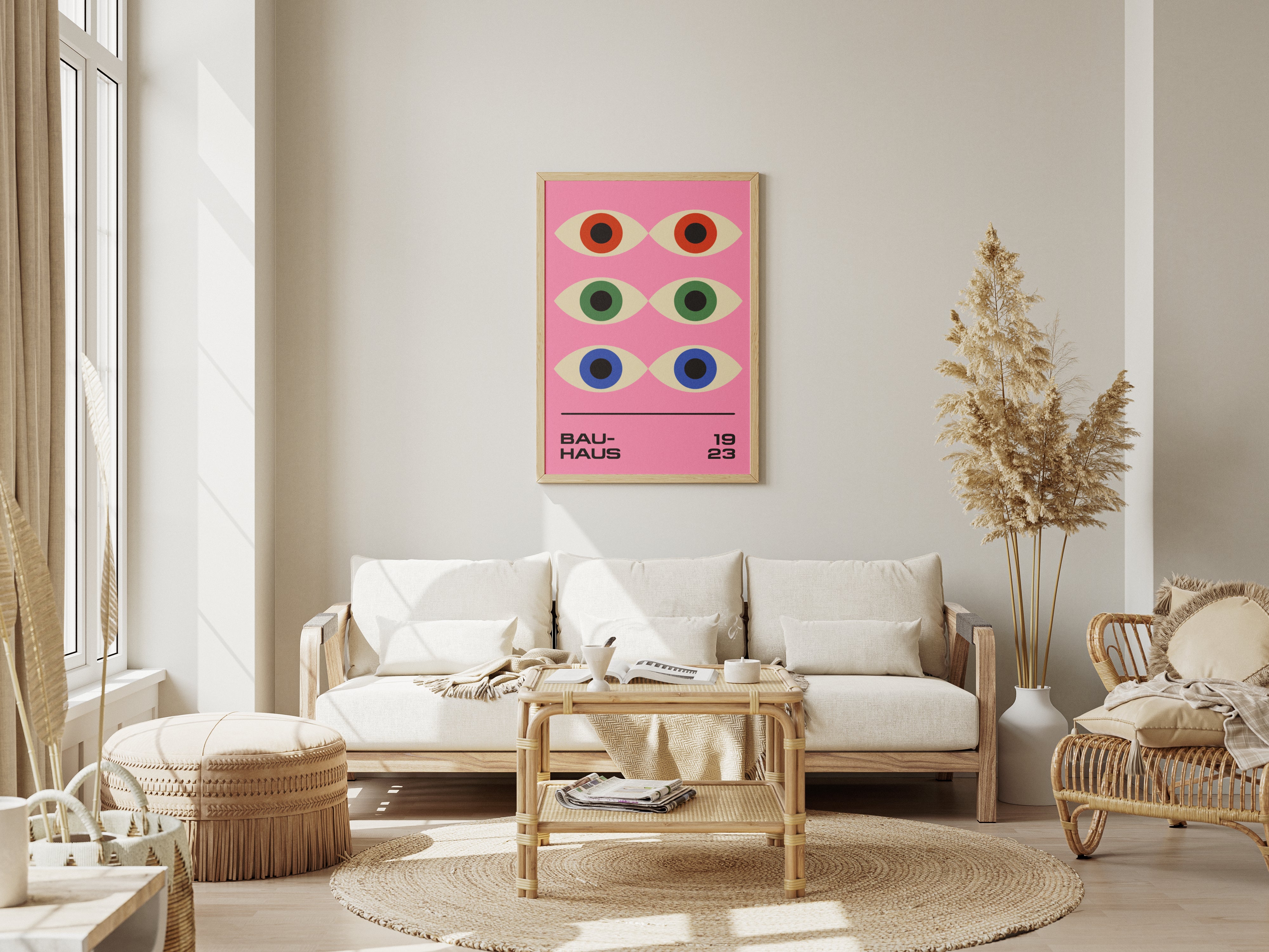 Szukasz wyjątkowej dekoracji, która doda Twojemu wnętrzu charakteru i stylu? Nasze plakaty inspirowane twórczością Bauhaus to idealny wybór! Wspaniały plakat przedstawiający oczy proroka w różnych kolorach na różowym tle, inspirowane plakatem Bauhaus z 1923 roku.