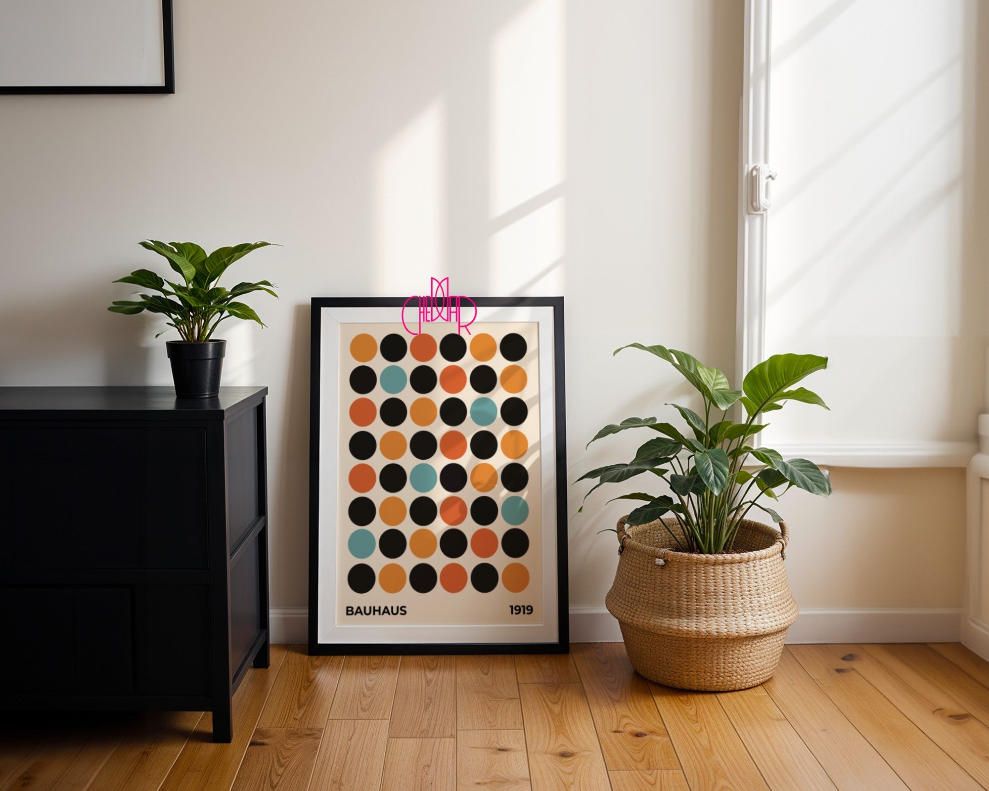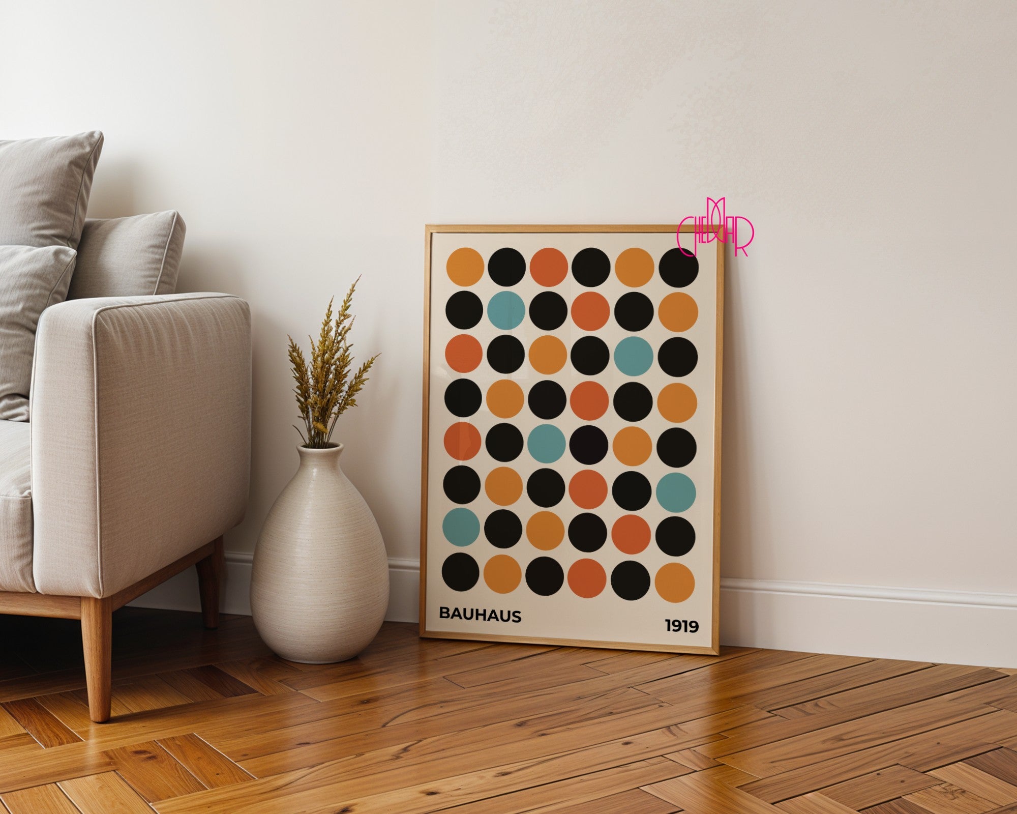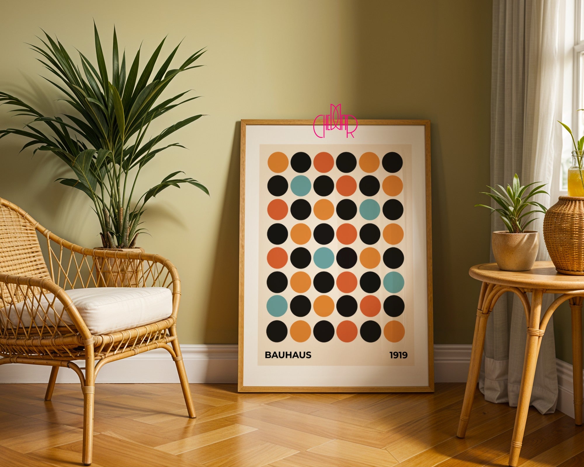 Dodaj wyjątkowy akcent do swojego wnętrza dzięki plakatowi inspirowanemu Bauhausem – „Kolorowe kropki na beżowym tle”. Minimalistyczna kompozycja, geometryczne formy i harmonijna paleta barw nawiązują do modernizmu i idei Bauhausu z 1919 roku. To idealna dekoracja dla miłośników designu, prostoty i ponadczasowej estetyki, która świetnie odnajdzie się zarówno w nowoczesnych, jak i klasycznych przestrzeniach.