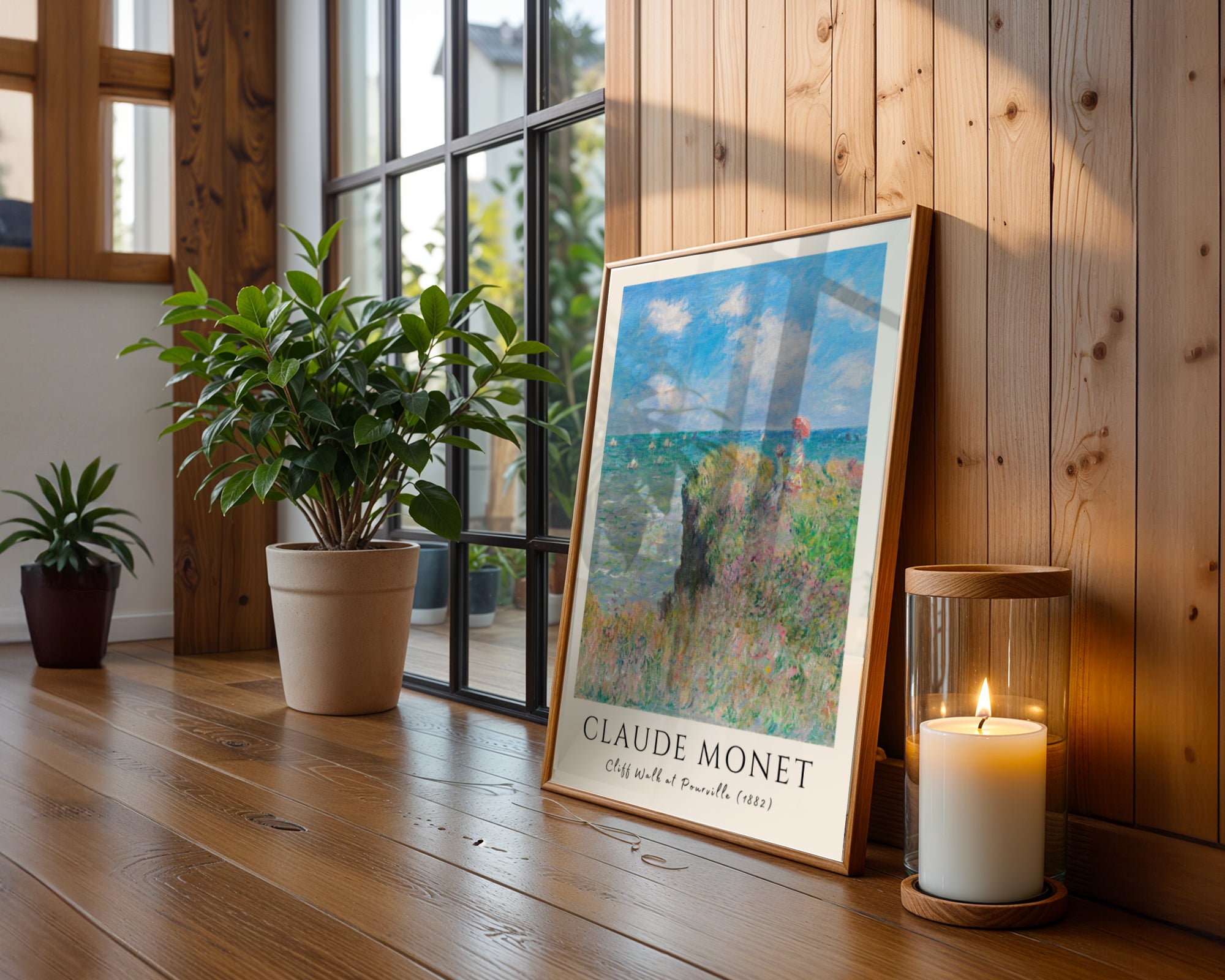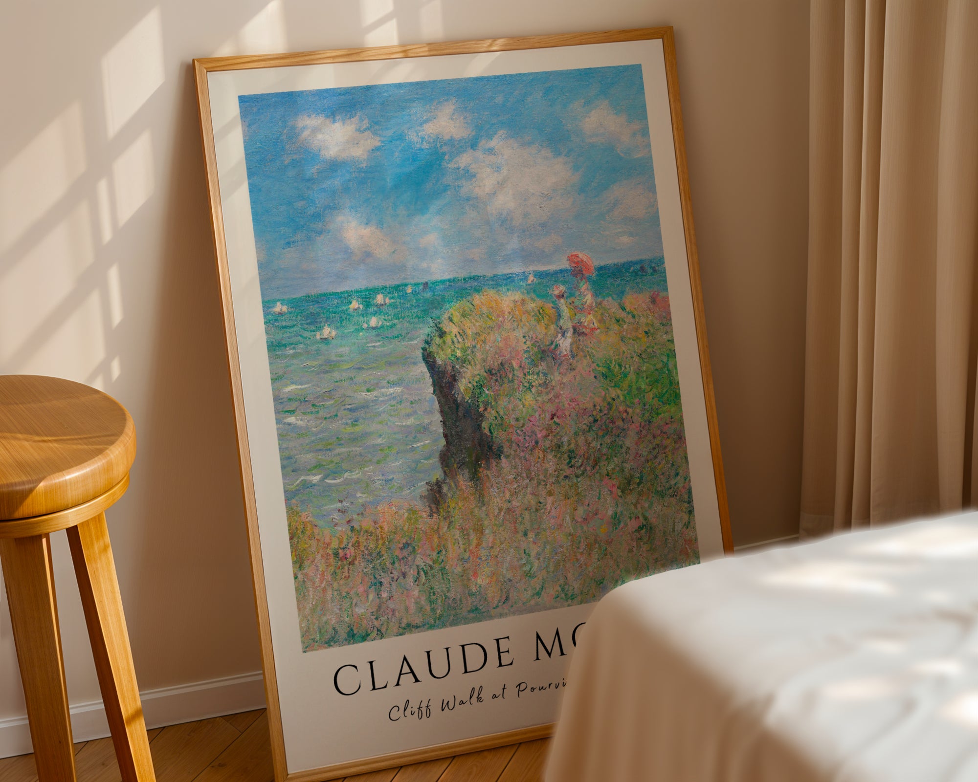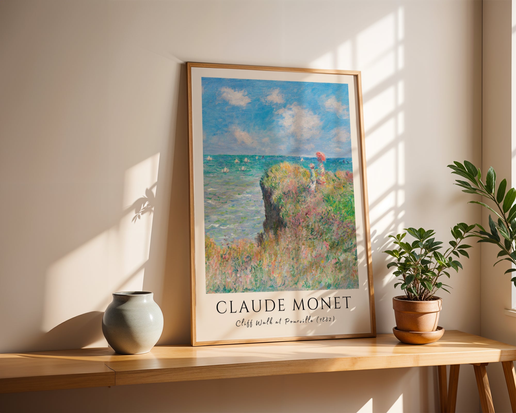 Odkryj wolność zamkniętą w impresjonistycznym pejzażu Zanurz się w sielskiej atmosferze francuskiego wybrzeża dzięki temu wyjątkowemu plakatowi z dziełem „Cliff Walk at Pourville” (1882) autorstwa Claude’a Moneta. Grafika przedstawia dwie postacie spacerujące krawędzią wysokiego klifu, spoglądające na błękitne wody kanału La Manche, po którym leniwie suną białe żagle. To arcydzieło impresjonizmu, w którym Monet z niezrównaną lekkością oddał ruch traw smaganych wiatrem, migotanie fal oraz nieskończoną głębię letniego nieba.