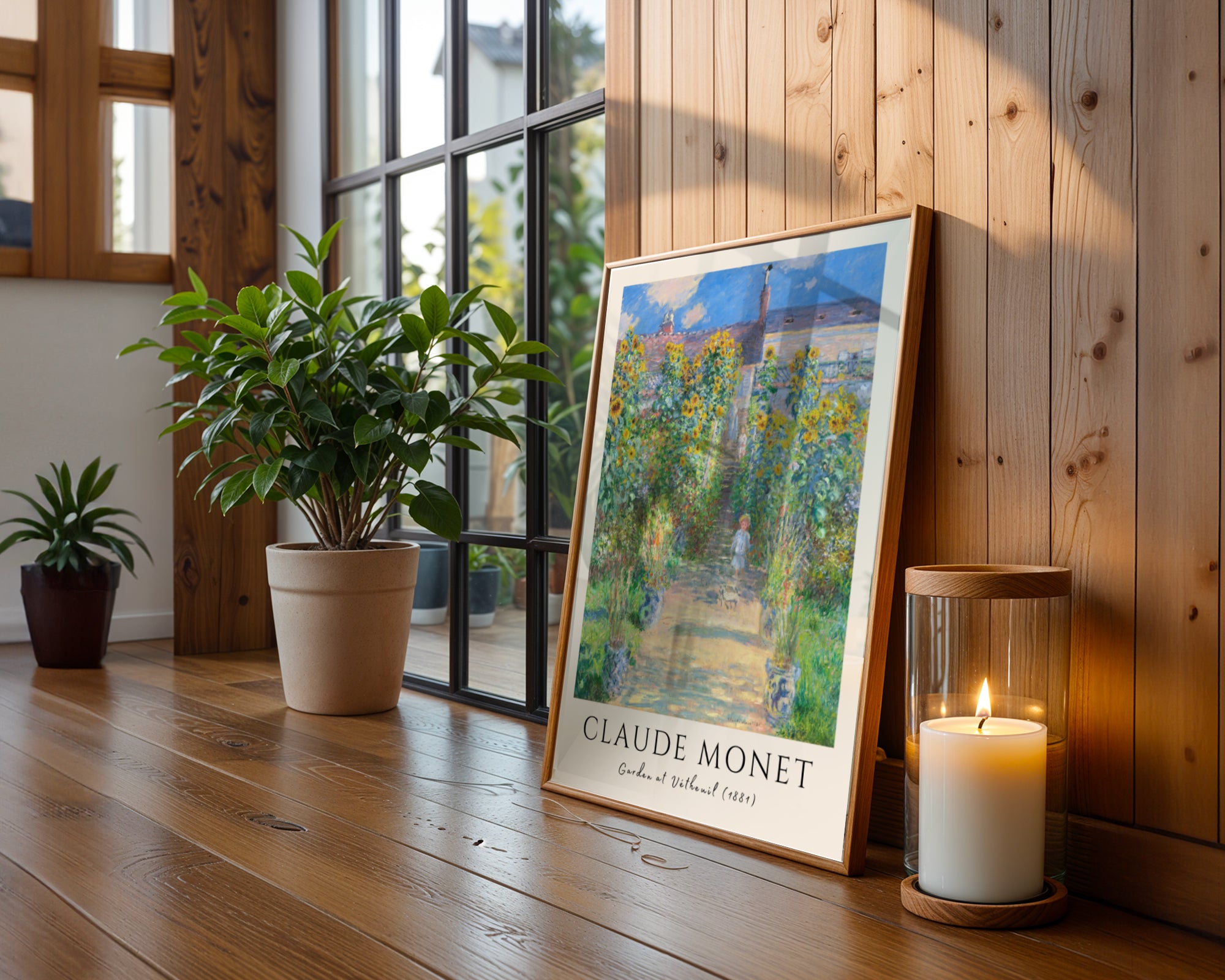 Zanurz się w świetle i barwach letniego ogrodu Przenieś się do malowniczego, skąpanego w słońcu Vétheuil dzięki temu wyjątkowemu plakatowi z dziełem „Garden at Vétheuil” (1881) autorstwa Claude’a Moneta. Grafika przedstawia mistrzowskie ujęcie ogrodu artysty, gdzie wysokie słoneczniki górują nad ścieżką prowadzącą do domu, a w oddali majaczą sylwetki dzieci. To kwintesencja dojrzałego impresjonizmu – obraz pełen wibrującego światła, krótkich pociągnięć pędzla i czystych kolorów, które wspólnie tworzą atmosferę spokoju i letniej beztroski.