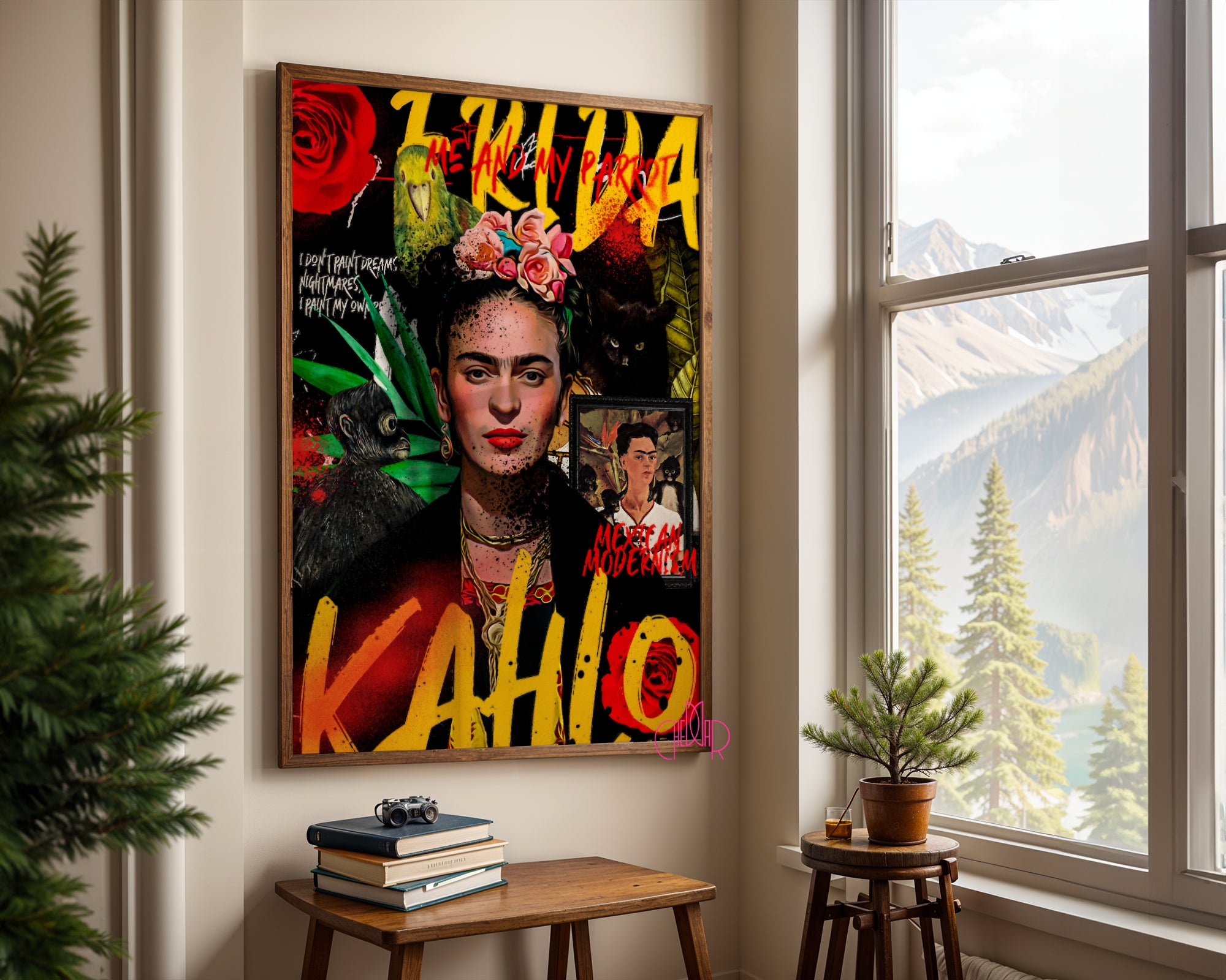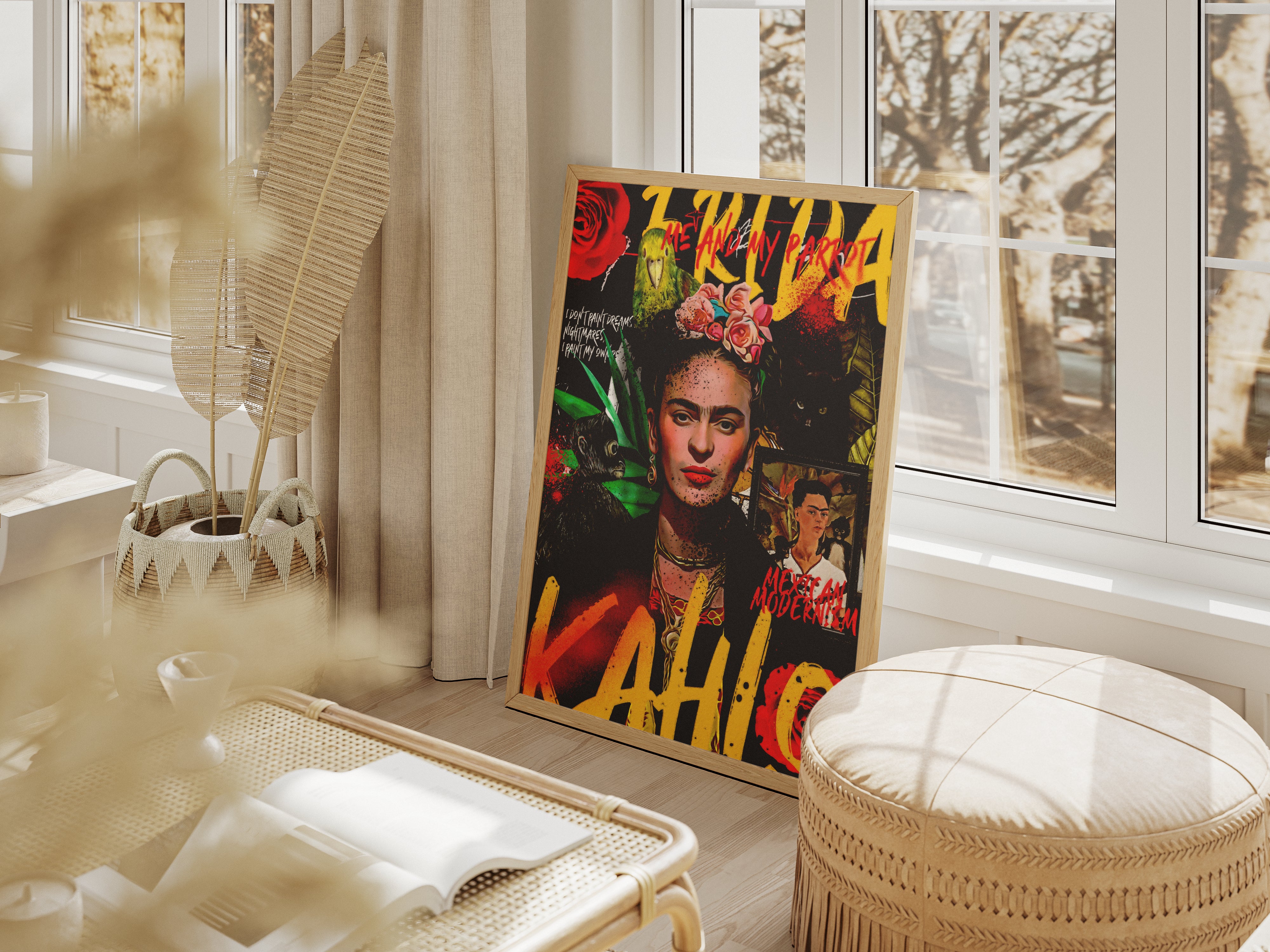 Odkryj głębię emocji ikony modernizmu Ten plakat to wielowarstwowa podróż przez życie i twórczość Fridy Kahlo. Centralny, klasyczny portret artystki został zestawiony z dynamicznymi elementami jej świata: wiernymi towarzyszami – małpą i papugą – oraz intensywnymi akcentami florystycznymi. Całość utrzymana jest w surowym stylu kolażu, gdzie jaskrawa żółć i głęboka czerń tworzą tło dla słynnego cytatu: "I don't paint dreams or nightmares, I paint my own reality".