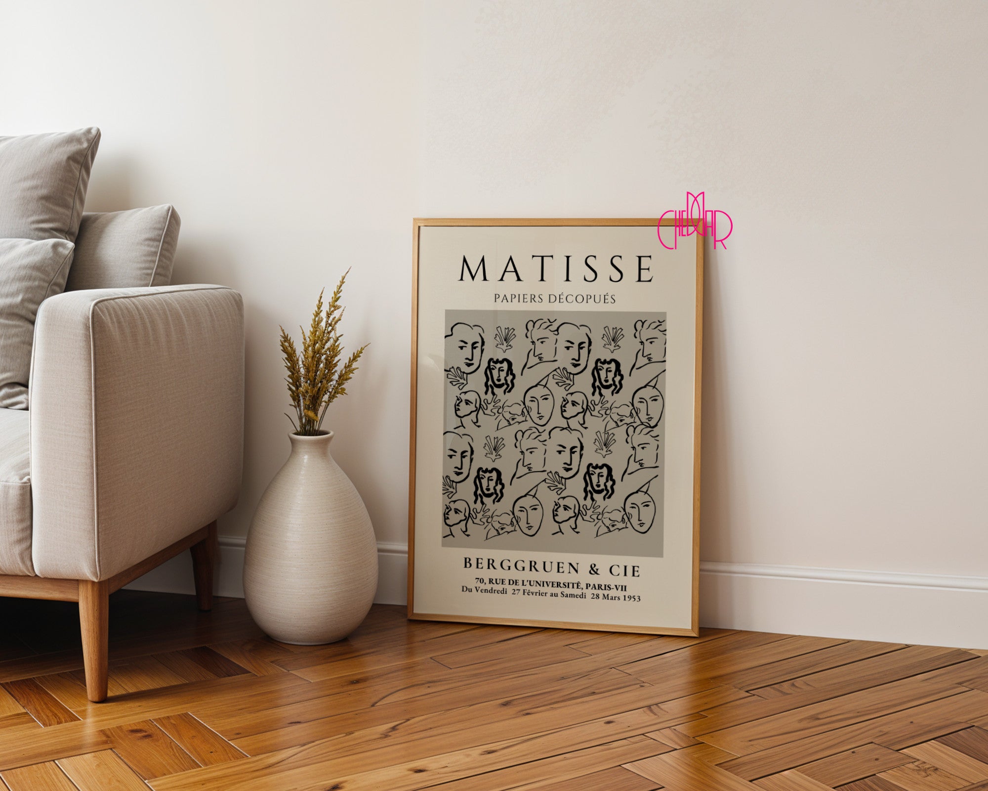 Plakat, utrzymany w szlachetnej palecie beżu, czerni i szarości, nawiązuje do historycznego wydarzenia z 1953 roku przy Rue de l'Université. To idealna propozycja dla miłośników klasycznego modernizmu i wyrafinowanego designu. Dzięki stonowanej kolorystyce grafika doskonale odnajdzie się w nowoczesnych biurach, minimalistycznych salonach czy sypialniach w stylu skandynawskim, dodając wnętrzu intelektualnego charakteru i galeryjnego prestiżu.