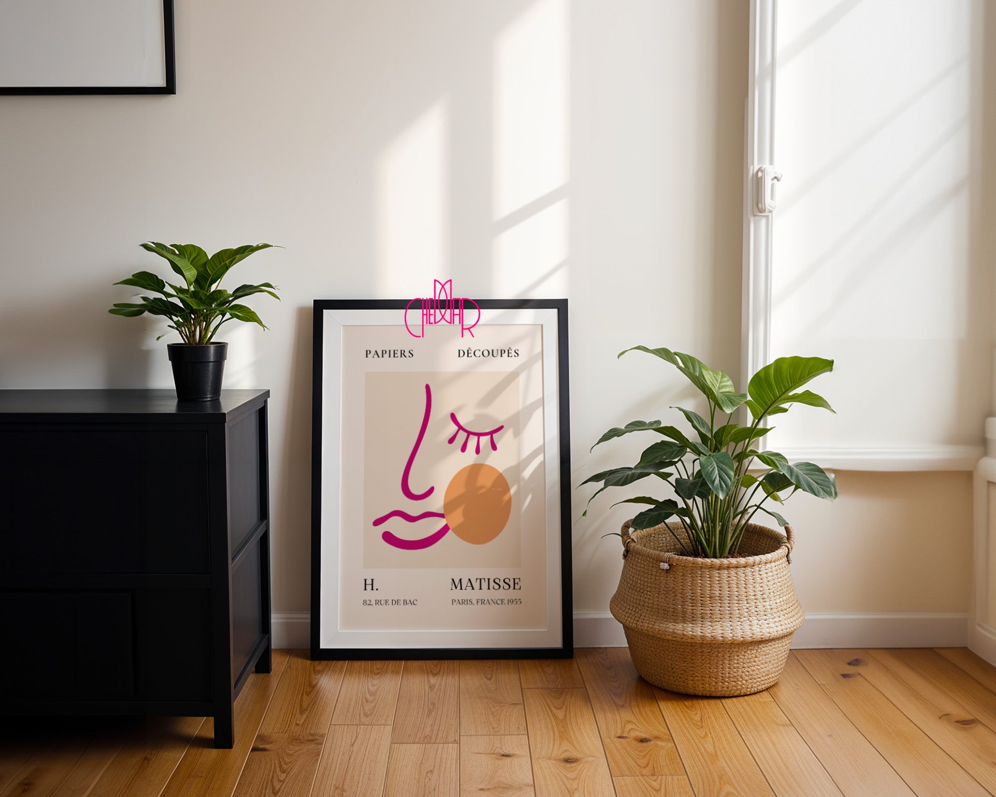 Plakat nawiązuje do słynnej stylistyki Matisse’a z połowy lat 50., łącząc paryską elegancję z odważnym, nowoczesnym spojrzeniem na portret. Intensywna fuksja linii na kremowym tle sprawia, że grafika jest niezwykle wyrazista, a jednocześnie lekka w odbiorze. To idealna dekoracja do przestrzeni biurowych, nowoczesnych korytarzy czy salonów, w których sztuka ma prowokować do myślenia i przyciągać wzrok.