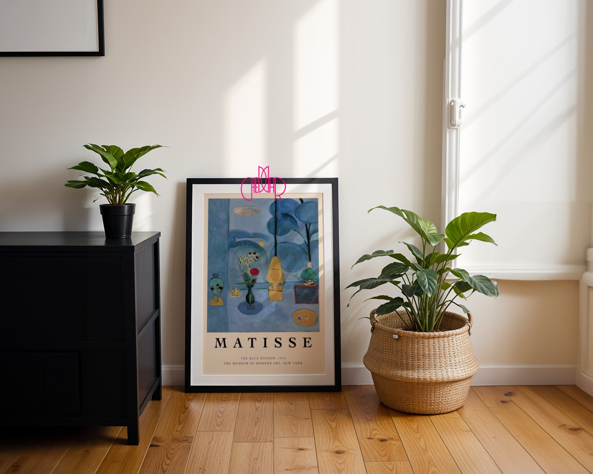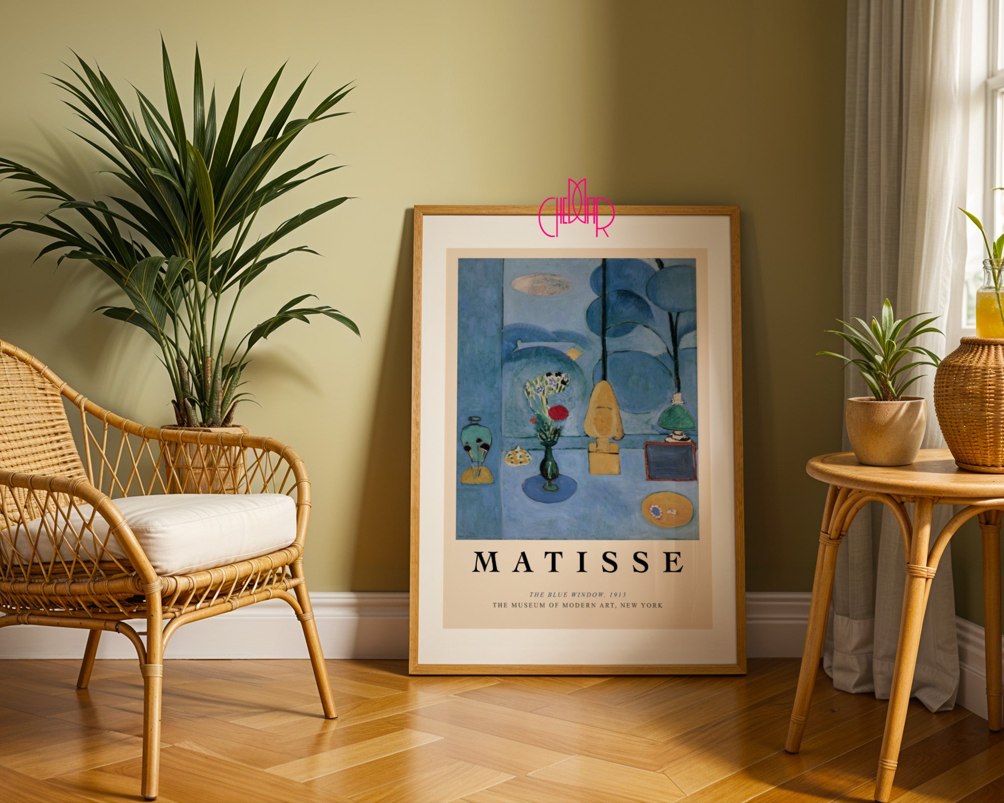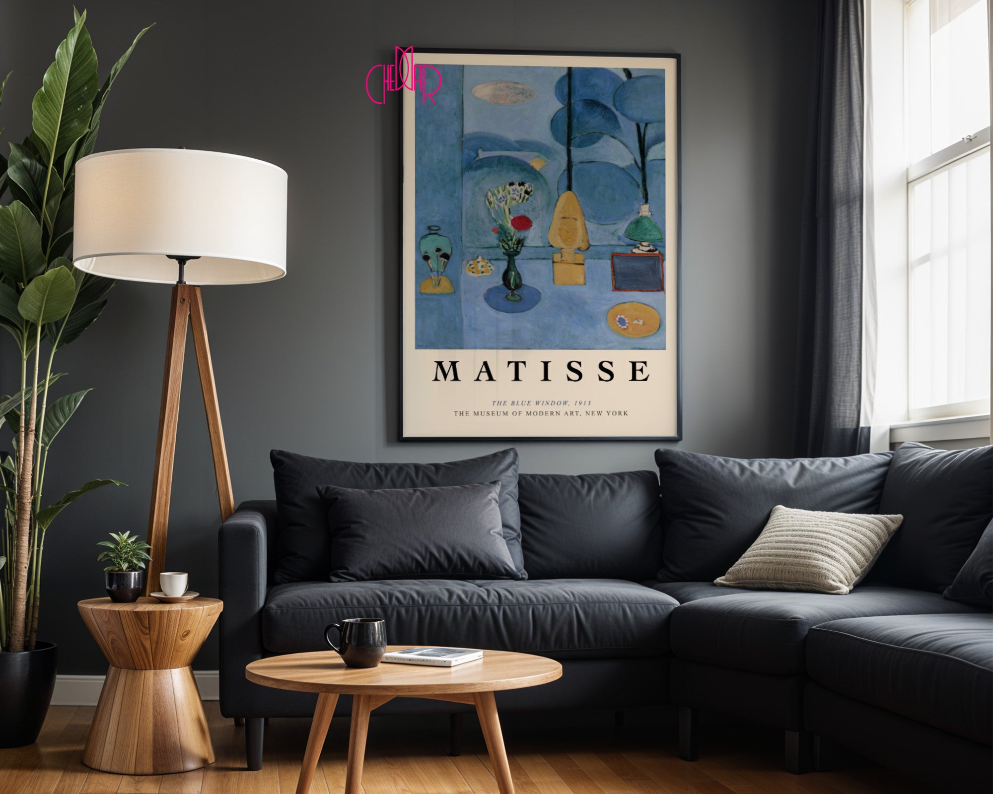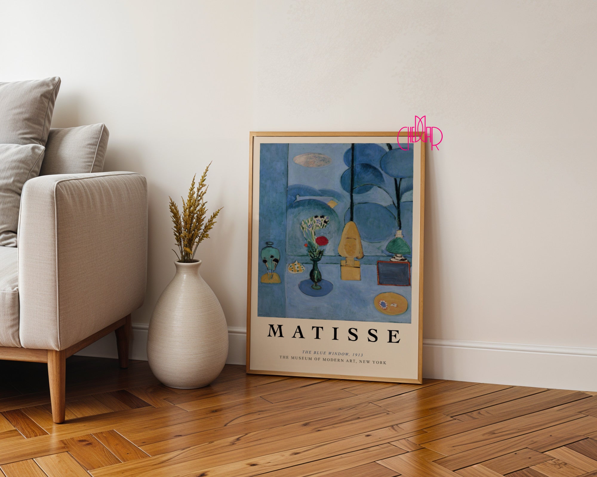 Błękitna kontemplacja i harmonia detalu Przenieś się do pracowni Henri Matisse’a w Issy-les-Moulineaux dzięki plakatowi przedstawiającemu „The Blue Window” – jedno z najważniejszych dzieł w dorobku artysty. Ta niezwykła kompozycja to studium błękitu, który spaja świat zewnętrzny (ogród) z intymnym wnętrzem pokoju. Na plakacie widzimy starannie ułożone przedmioty – wazon z kwiatami, statuetkę i naczynia – które zdają się unosić w eterycznej, szafirowej przestrzeni, tworząc atmosferę spokoju i głębokiej zadumy.