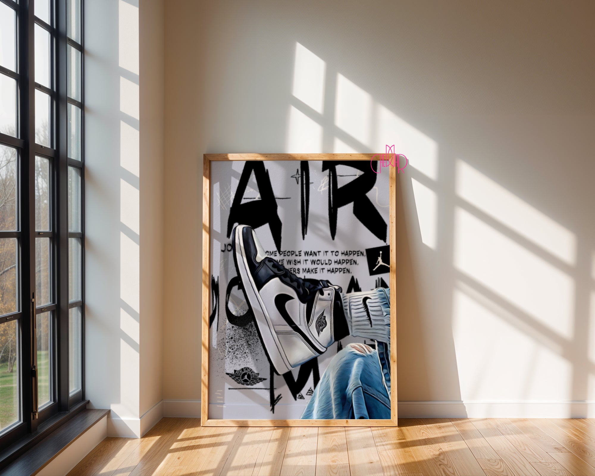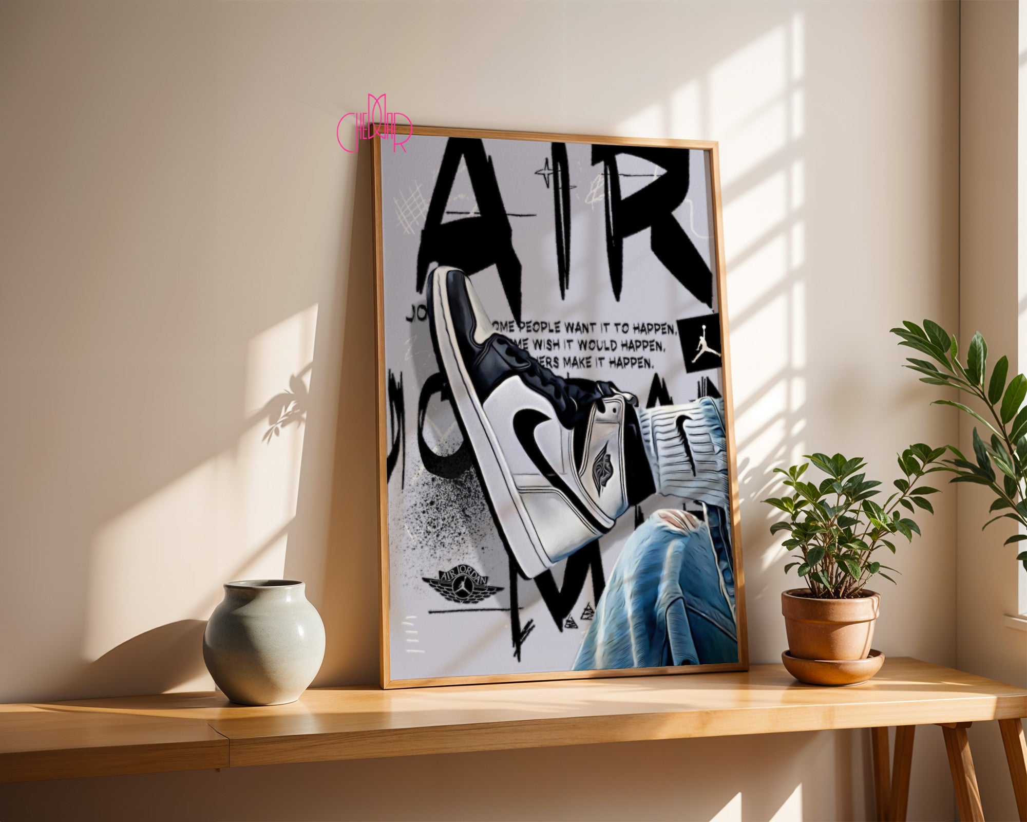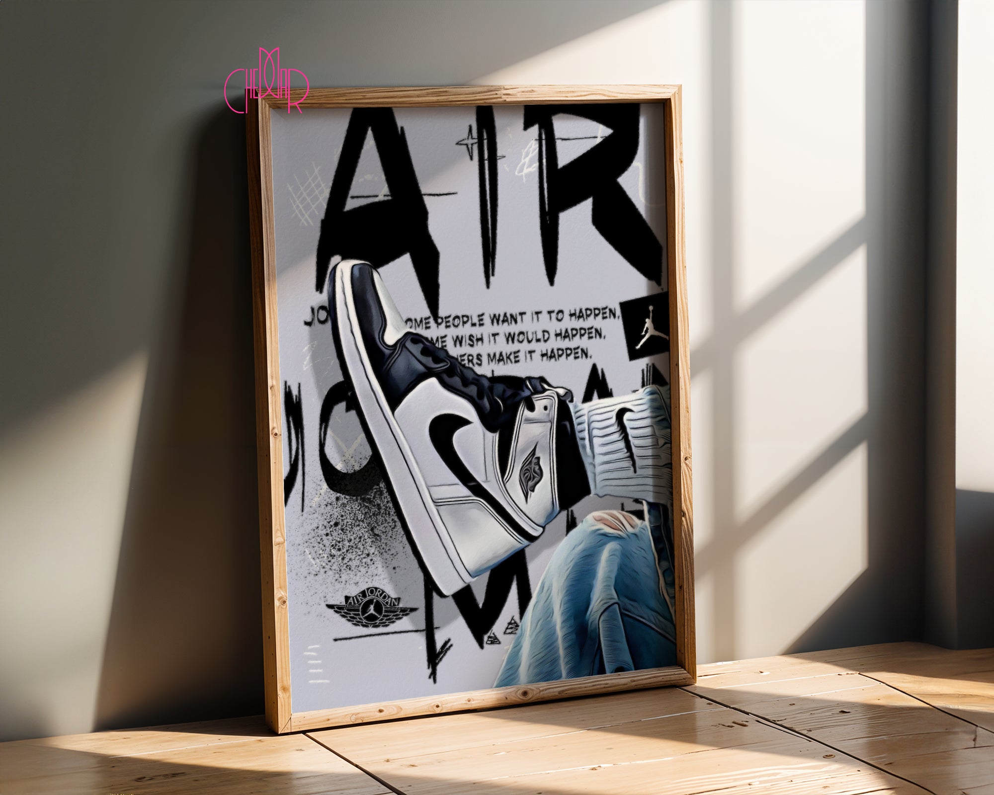 Zamień marzenia w rzeczywistość Ten plakat to hołd dla determinacji i pasji, która napędza każdego sportowca i kolekcjonera. Przedstawia on klasyczną sylwetkę buta typu „High” w ponadczasowej, biało-czarnej kolorystyce, zestawioną z teksturą spranego jeansu i surowym, miejskim tłem. Centralnym punktem grafiki jest inspirujący cytat Michaela Jordana, który przypomina, że sukces nie dzieje się przez przypadek – jest wynikiem ciężkiej pracy i wiary w cel.