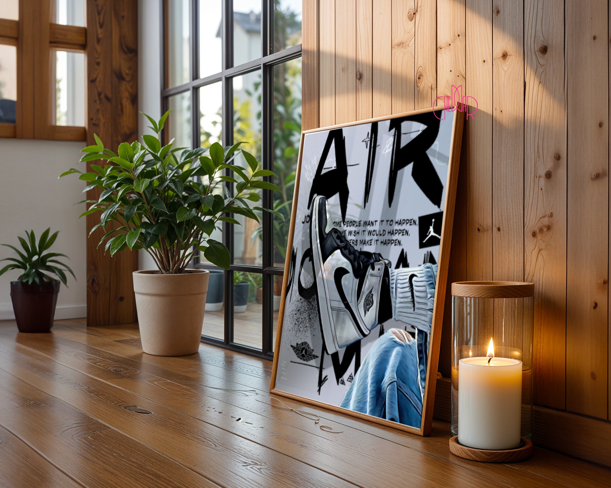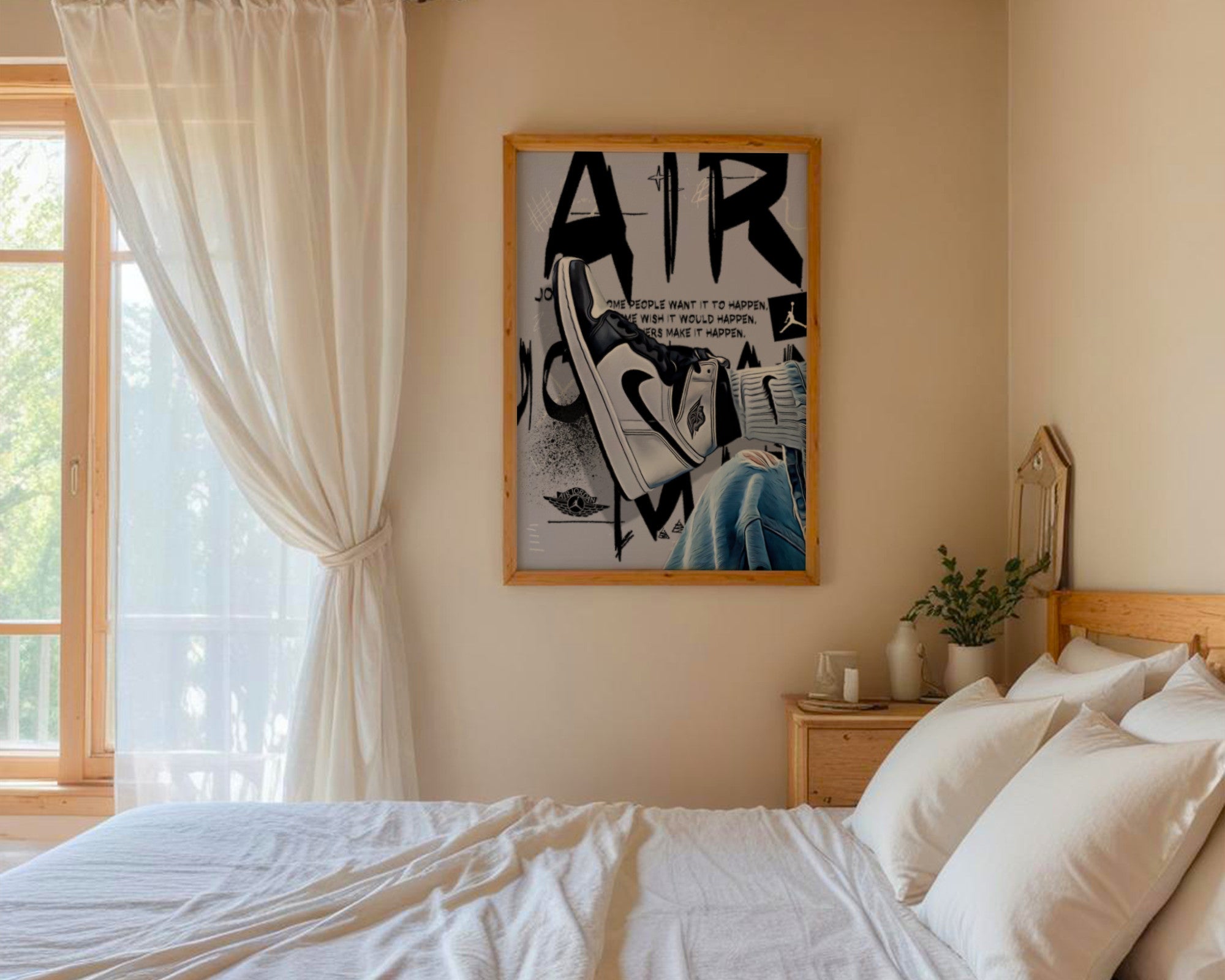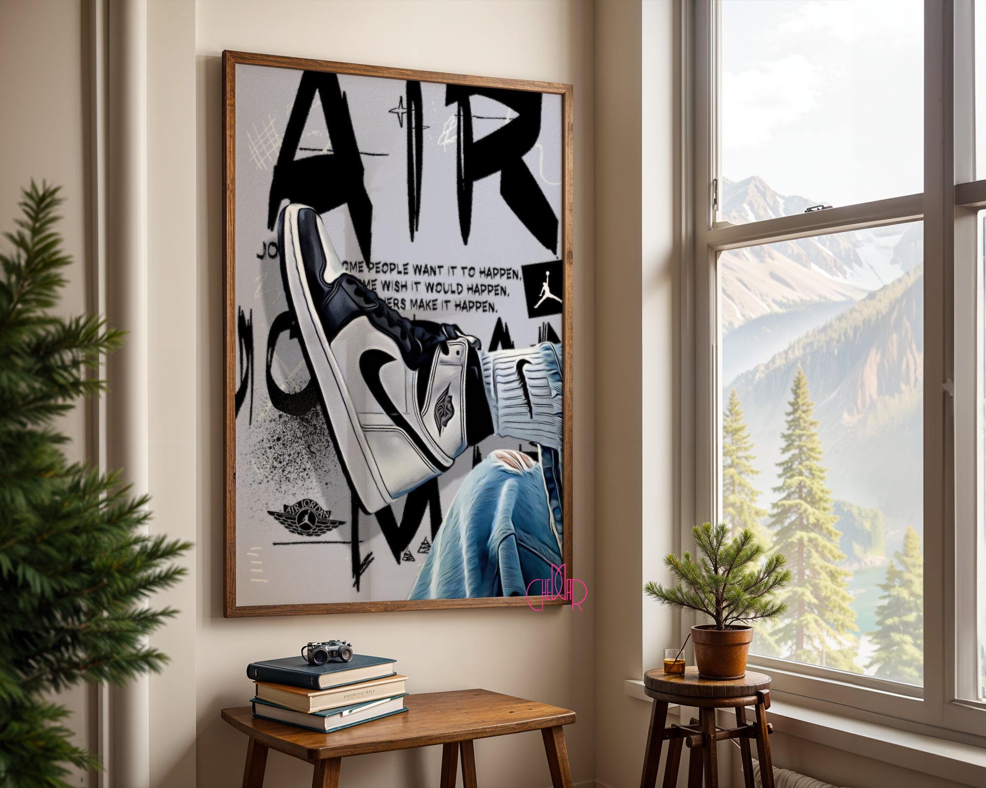 Zamień marzenia w rzeczywistość Ten plakat to hołd dla determinacji i pasji, która napędza każdego sportowca i kolekcjonera. Przedstawia on klasyczną sylwetkę buta typu „High” w ponadczasowej, biało-czarnej kolorystyce, zestawioną z teksturą spranego jeansu i surowym, miejskim tłem. Centralnym punktem grafiki jest inspirujący cytat Michaela Jordana, który przypomina, że sukces nie dzieje się przez przypadek – jest wynikiem ciężkiej pracy i wiary w cel.