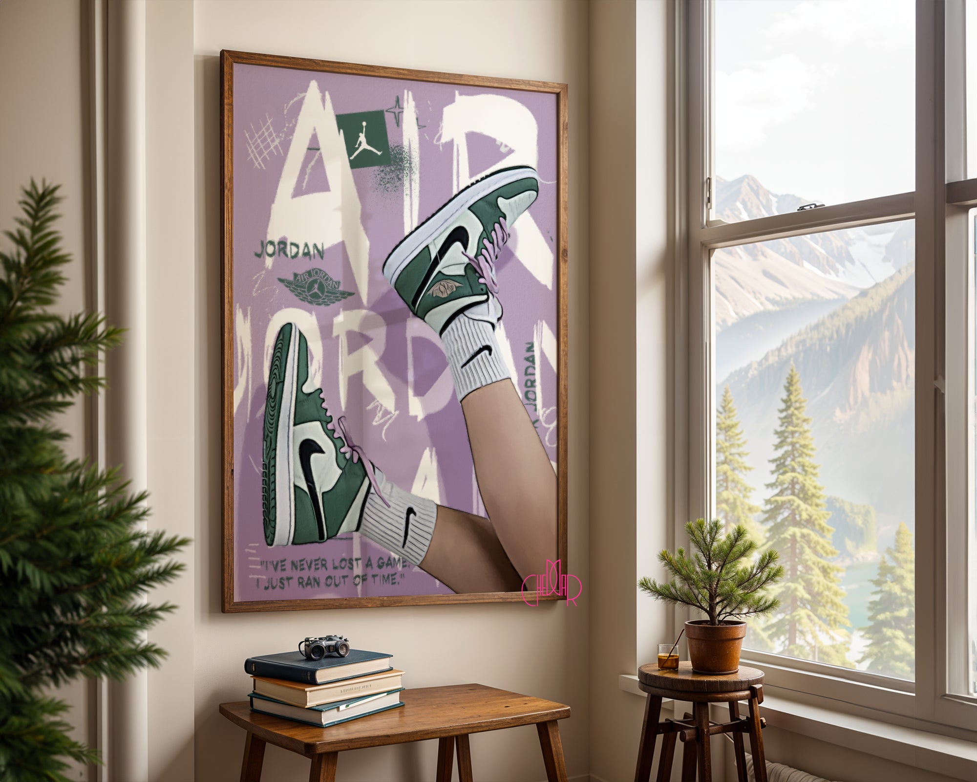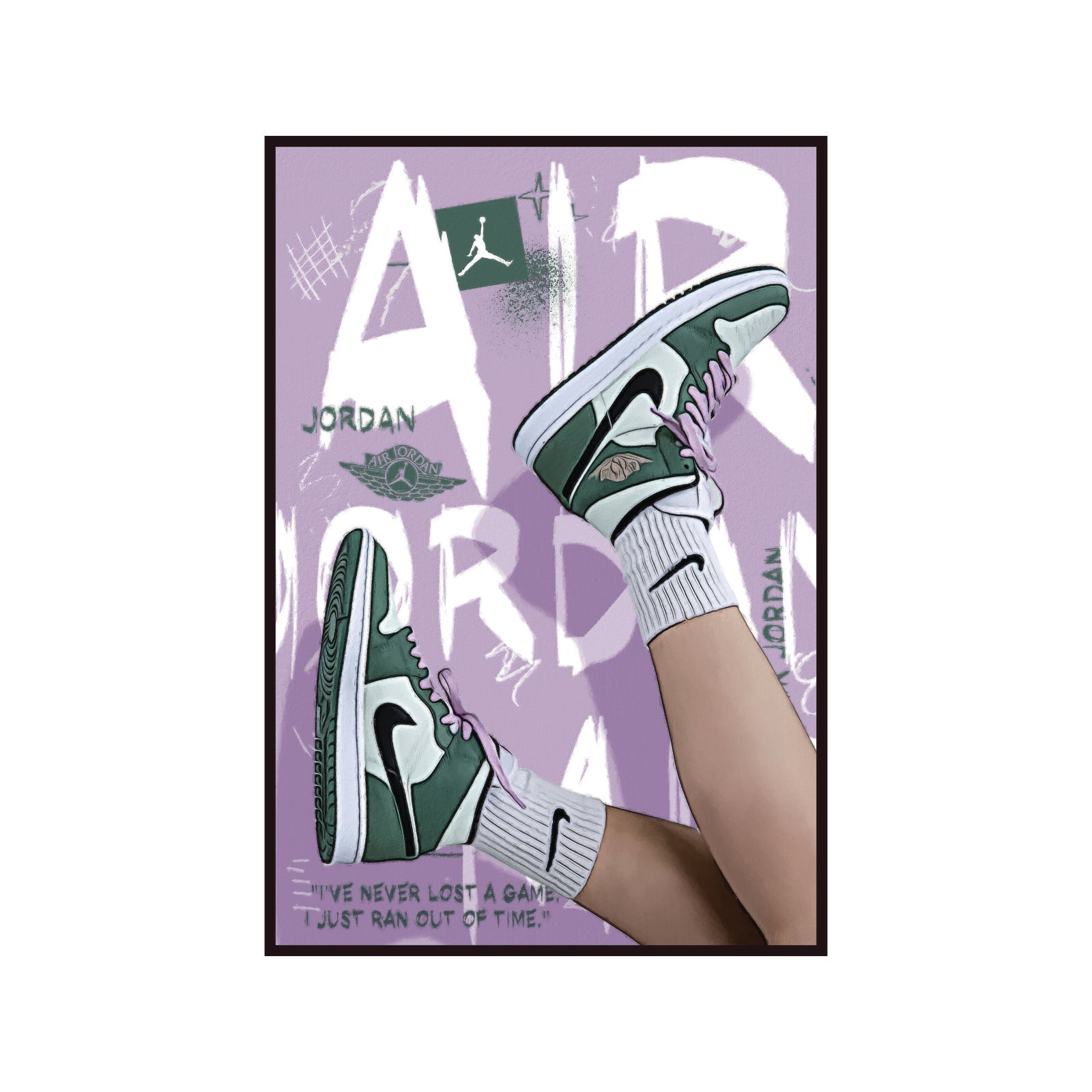 Przełam schematy kolorami, które inspirują Ten plakat to powiew świeżości w Twojej kolekcji, łączący dynamiczną kulturę sneakersową z nieoczywistą, lawendową paletą barw. Centralnym punktem grafiki są nogi w klasycznych butach typu „High” w unikalnej, butelkowej zieleni z kontrastującymi, różowymi sznurowadłami. To kompozycja dla osób, które cenią indywidualizm i chcą dodać swojemu wnętrzu lekkości, nie rezygnując przy tym z mocnego, miejskiego charakteru.
