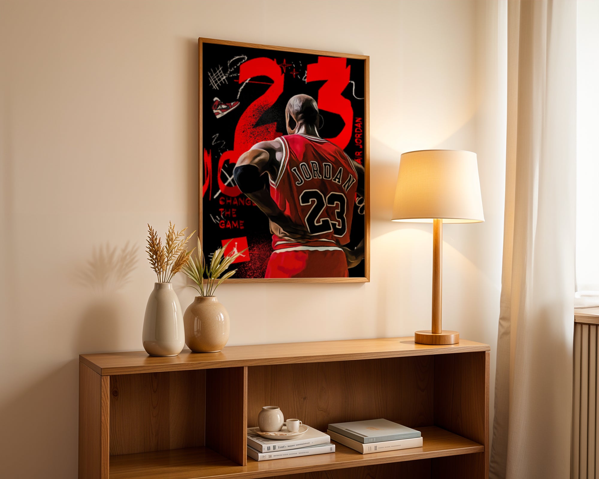 Poczuj energię legendy, która zdefiniowała sukces Ten plakat to dynamiczna eksplozja barw i emocji, oddająca istotę dziedzictwa Michaela Jordana. Grafika przedstawia mistrza od tyłu, skupiając wzrok na kultowym numerze "23", który stał się synonimem dążenia do doskonałości. Całość osadzona jest w estetyce surowego street-artu, gdzie czerwień, czerń i biel tworzą kompozycję pełną ruchu i buntu. To nie tylko dekoracja – to manifestacja hasła „Change the Game”.