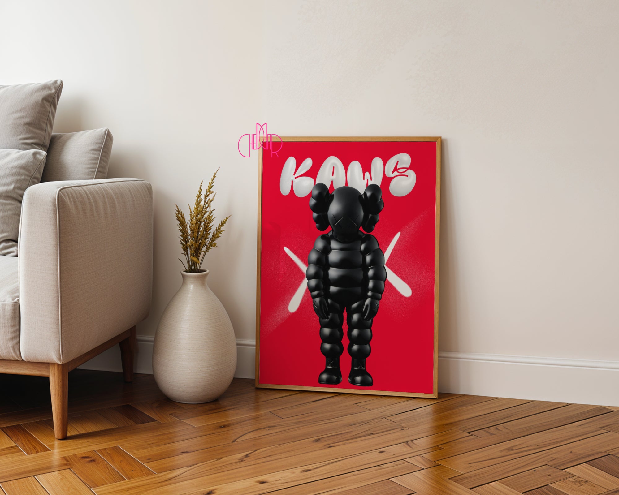 Energia, która dominuje przestrzeń Ten plakat to odważna interpretacja nowoczesnego designu, przedstawiająca kultową postać „CHUM” w głębokiej, satynowej czerni. Osadzona na intensywnym, karmazynowym tle, postać emanuje siłą i melancholią jednocześnie, co jest znakiem rozpoznawczym twórczości nurtu Pop Art. Wyrazista kolorystyka i charakterystyczna sylwetka inspirowana dziedzictwem popkultury sprawiają, że jest to dzieło, obok którego nie da się przejść obojętnie.