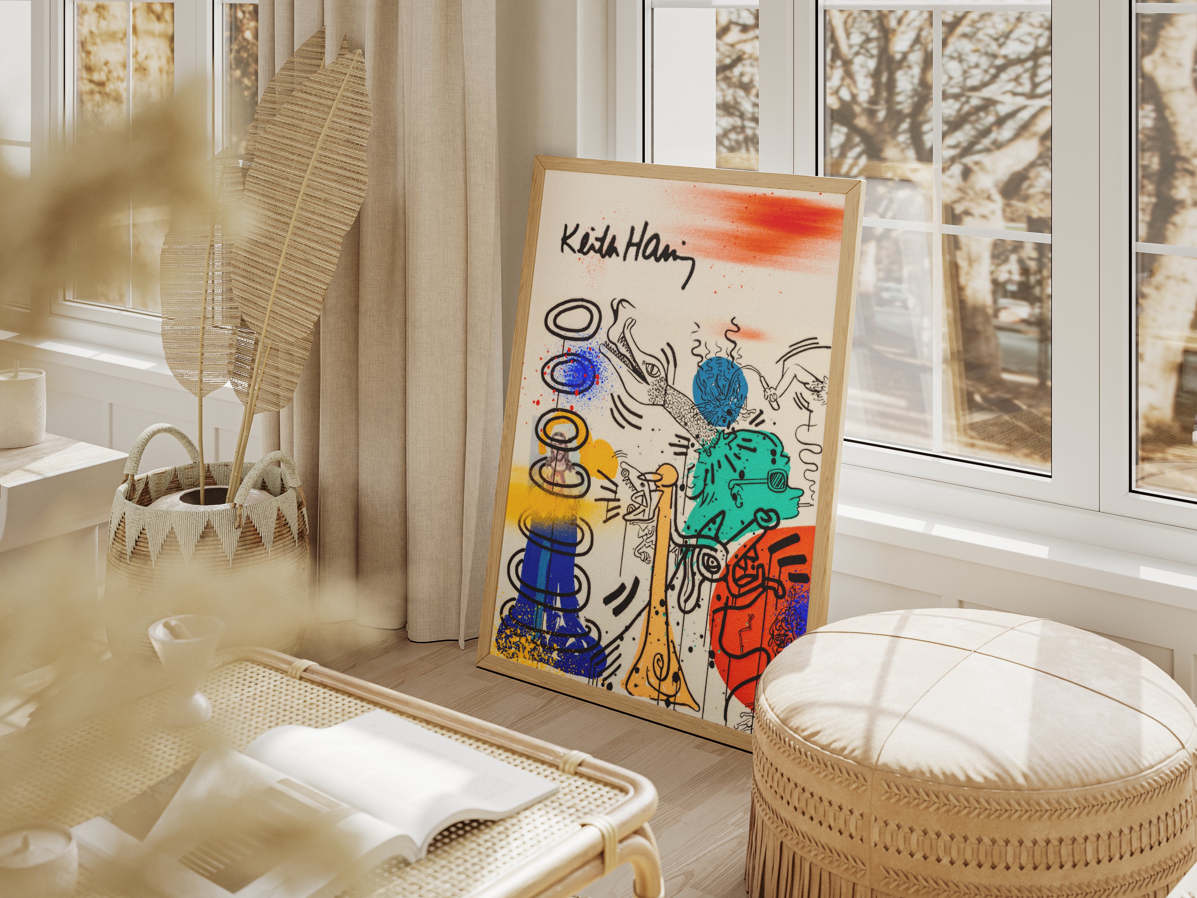 Autentyczny Podpis: Biały, odręczny napis „Keith Haring” w górnej części plakatu dopełnia całości, nadając jej galeryjnego charakteru.