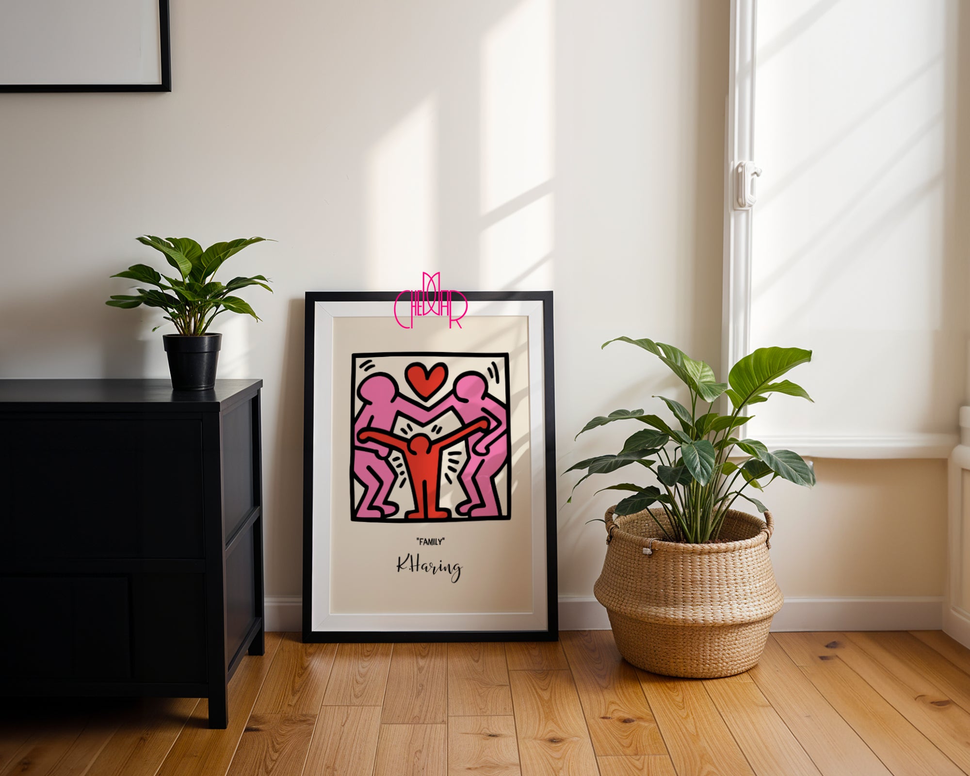 Plakat inspirowany twórczością słynnego artysty Keith'a Haring'a, którego prace stały się ikonami pop-artu i street artu na całym świecie! To jedna z charakterystycznych, dynamicznych kompozycji Haringa, przedstawiająca żywe, ruchliwe postacie w prostym, ale bardzo wyrazistym stylu. Typowe dla Haringa, jego prace są pełne energii, kontrastowych kolorów i uniwersalnych symboli, które celebrują miłość, wolność i równość.