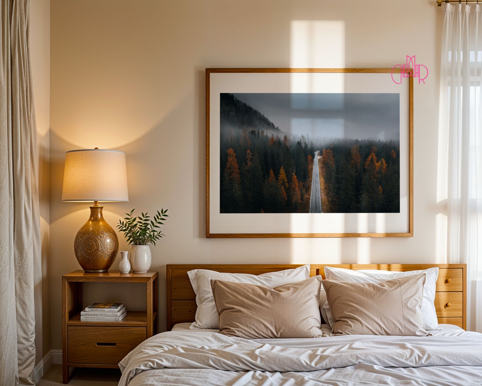 Przenieś się w magiczny, jesienny krajobraz za każdym razem, gdy spojrzysz na ścianę. Ta nastrojowa fotografia przedstawia pustą drogę, która zanika we mgle, otoczona drzewami o intensywnych, jesiennych barwach. To idealna dekoracja ścienna dla osób poszukujących ukojenia, inspiracji do podróży i unikalnego elementu wystroju.