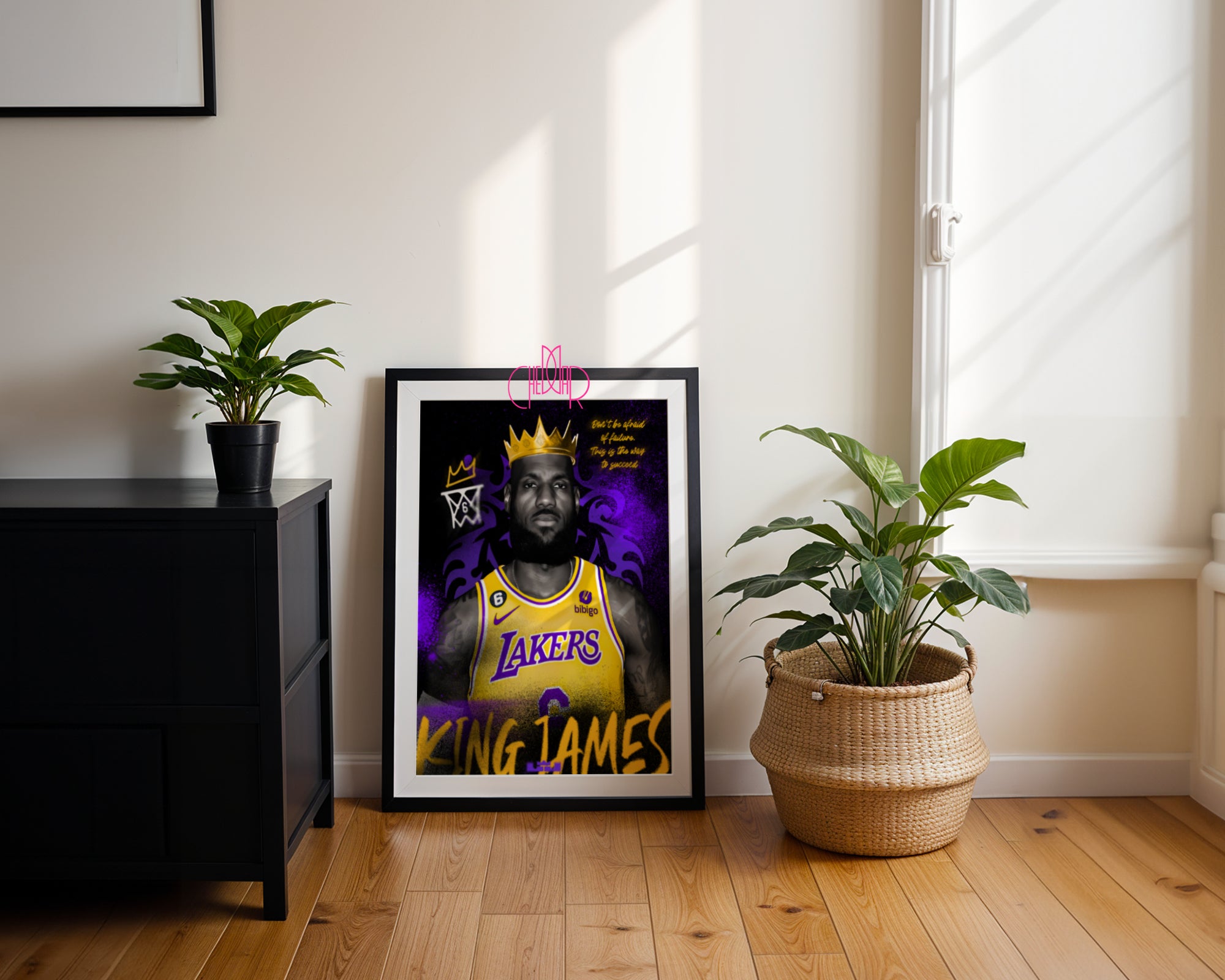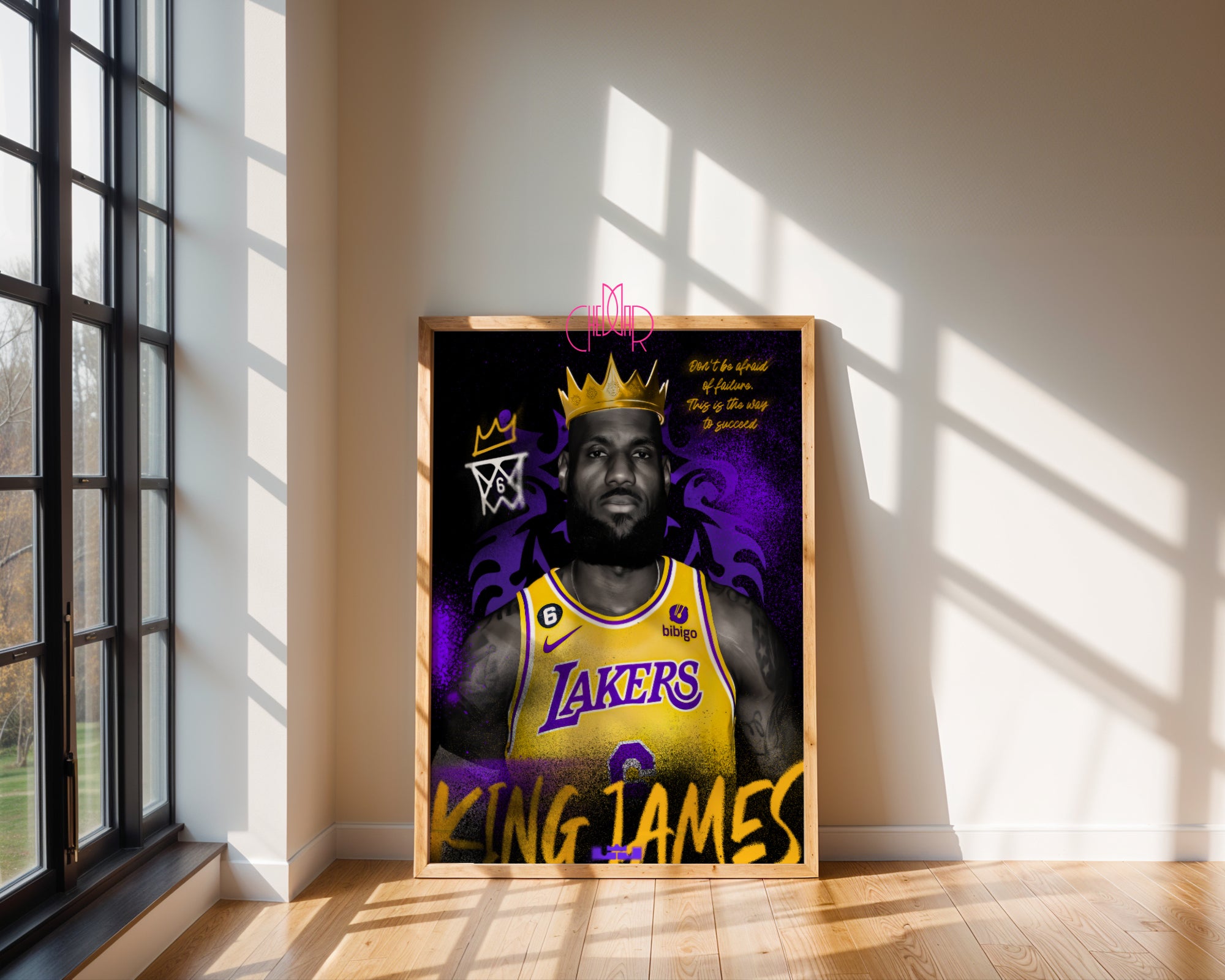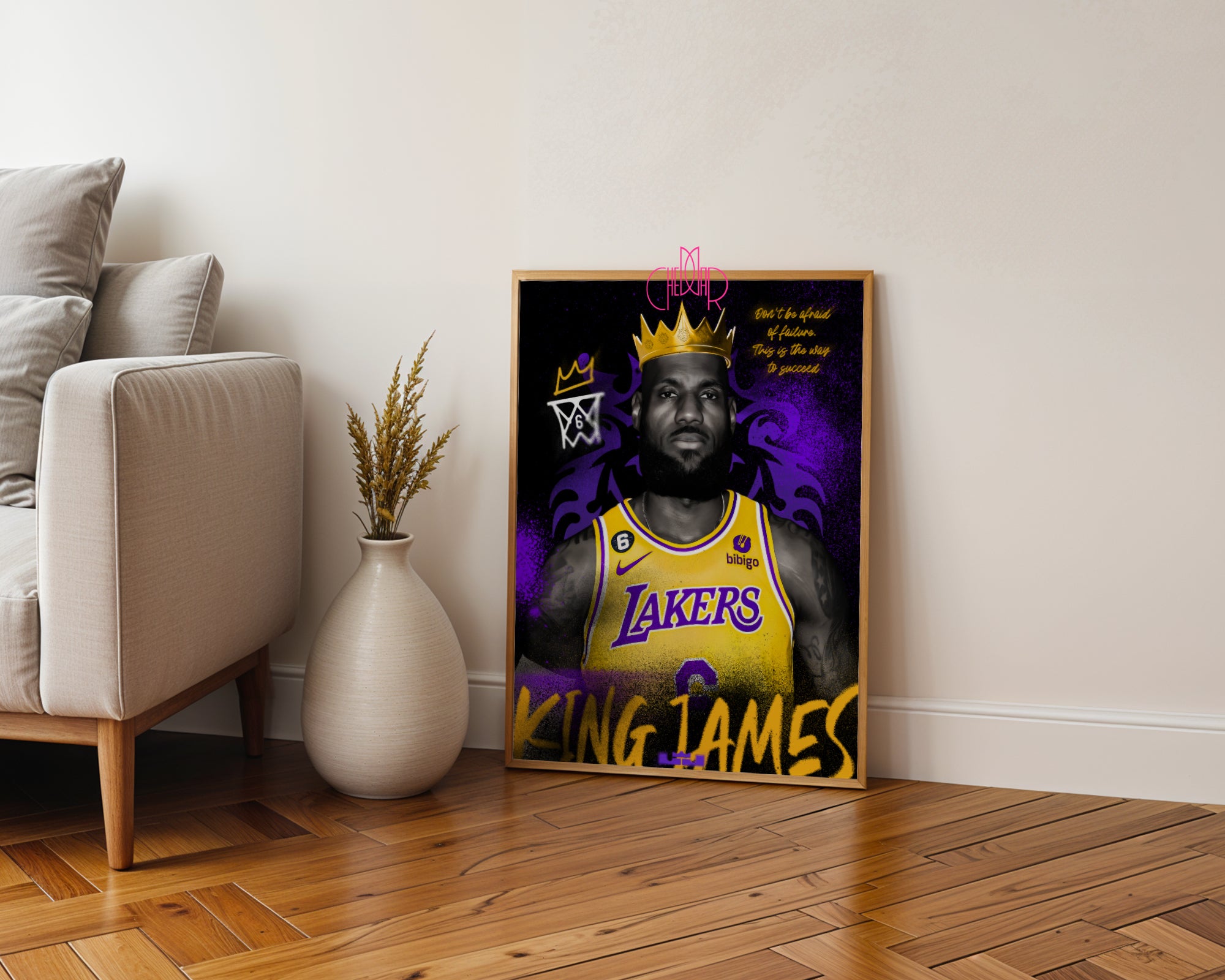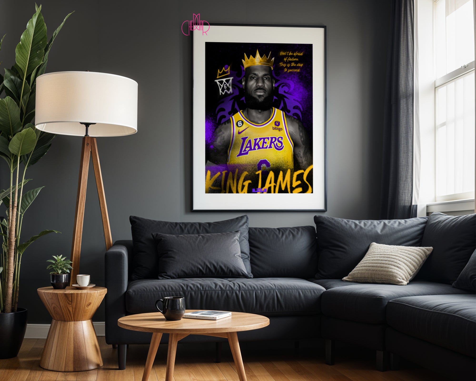 Ukoronuj swoje wnętrze duchem zwycięstwa Ten plakat to potężny portret LeBrona Jamesa, który celebruje jego status jako jednego z najwybitniejszych liderów w historii NBA. Centralna postać zawodnika w charakterystycznym żółtym stroju Los Angeles Lakers emanuje spokojem i niezachwianą pewnością siebie. Całość została wzbogacona o wyraziste elementy graficzne: lśniącą, złotą koronę na głowie LeBrona oraz dynamiczne, purpurowe tło o strukturze sprayu, które nadaje pracy nowoczesny, miejski charakter. To wizualna opowieść o ambicji, która nie zna granic.