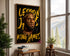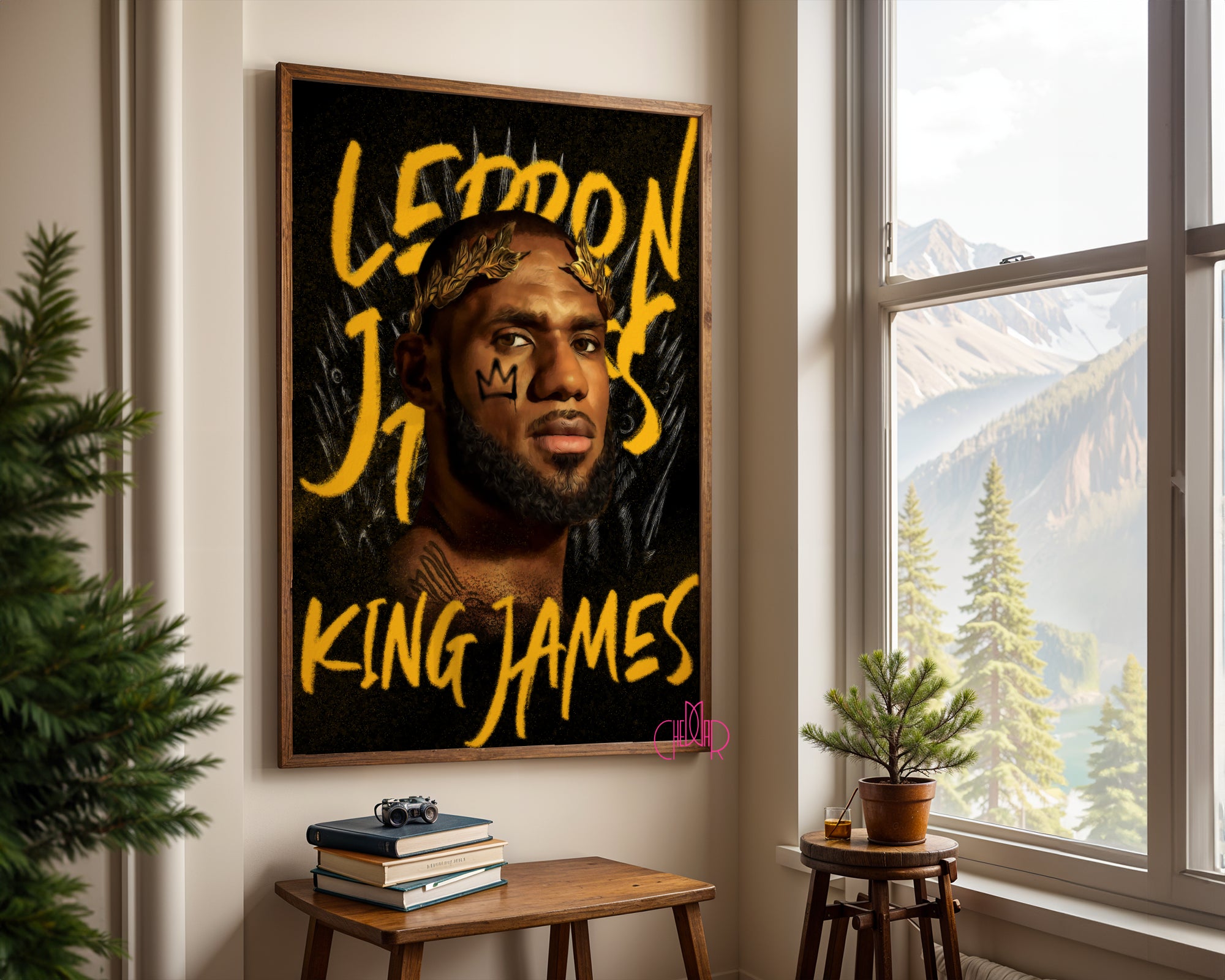 Ekspresyjna Typografia: Wyraziste, żółte napisy „LEBRON JAMES” i „KING JAMES” w stylu grubego pędzla tworzą dynamiczny kontrast z ciemnym, teksturowanym tłem.