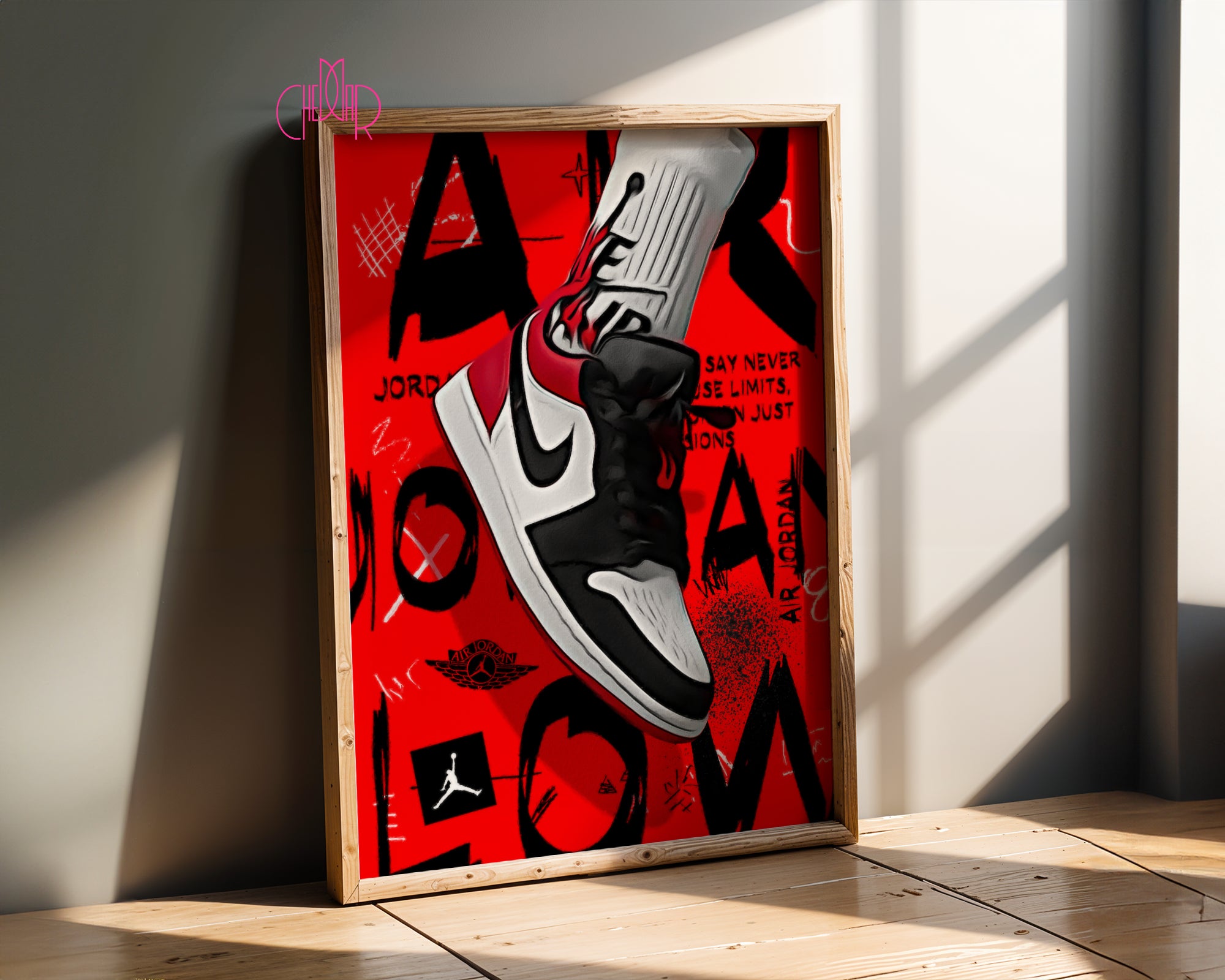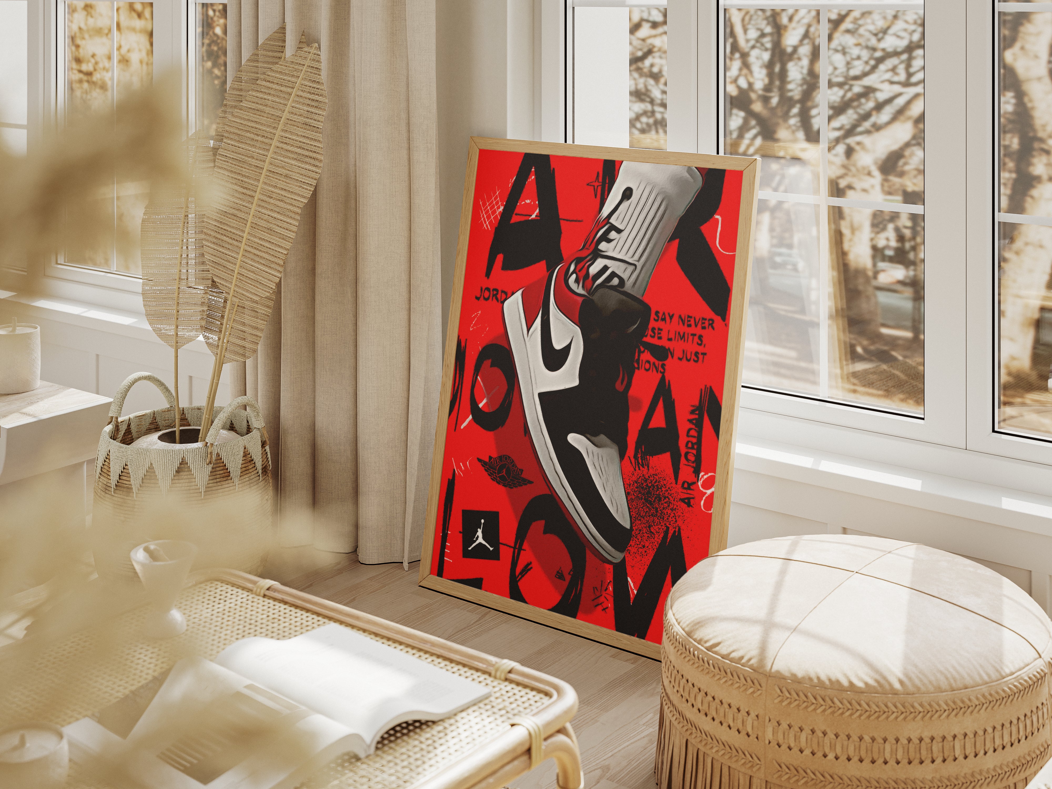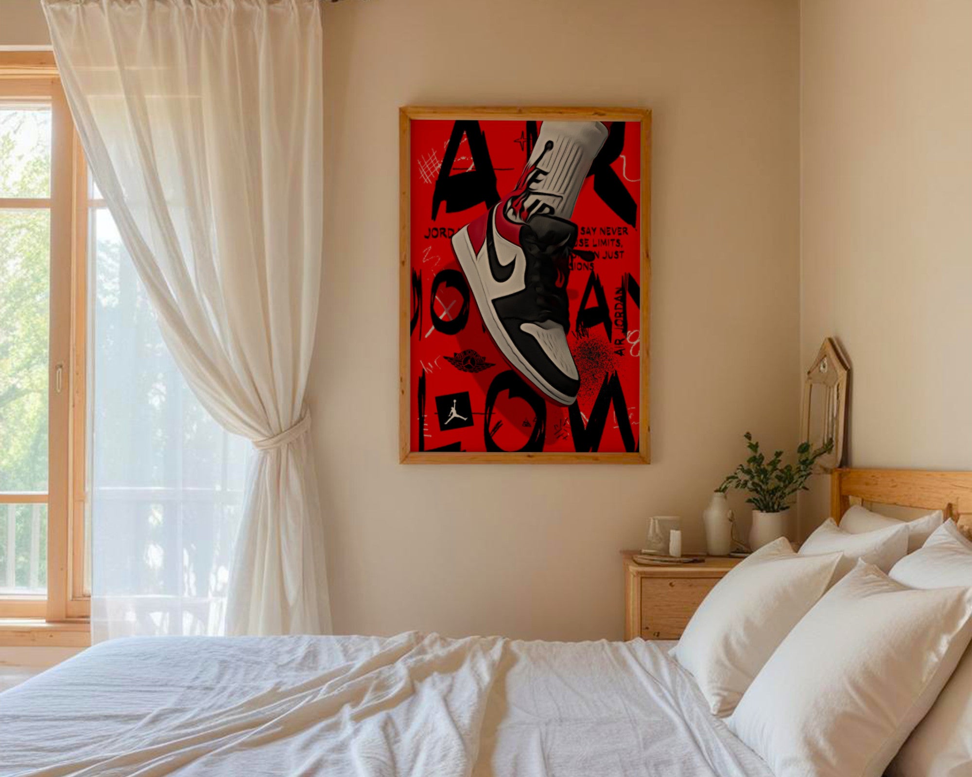 Minimalistyczna Typografia: U dołu plakatu znajduje się subtelny napis „AIR JORDAN - BLACK JESUS - HIS AIRNESS”, który w dyskretny sposób oddaje hołd legendarnym przydomkom mistrza.