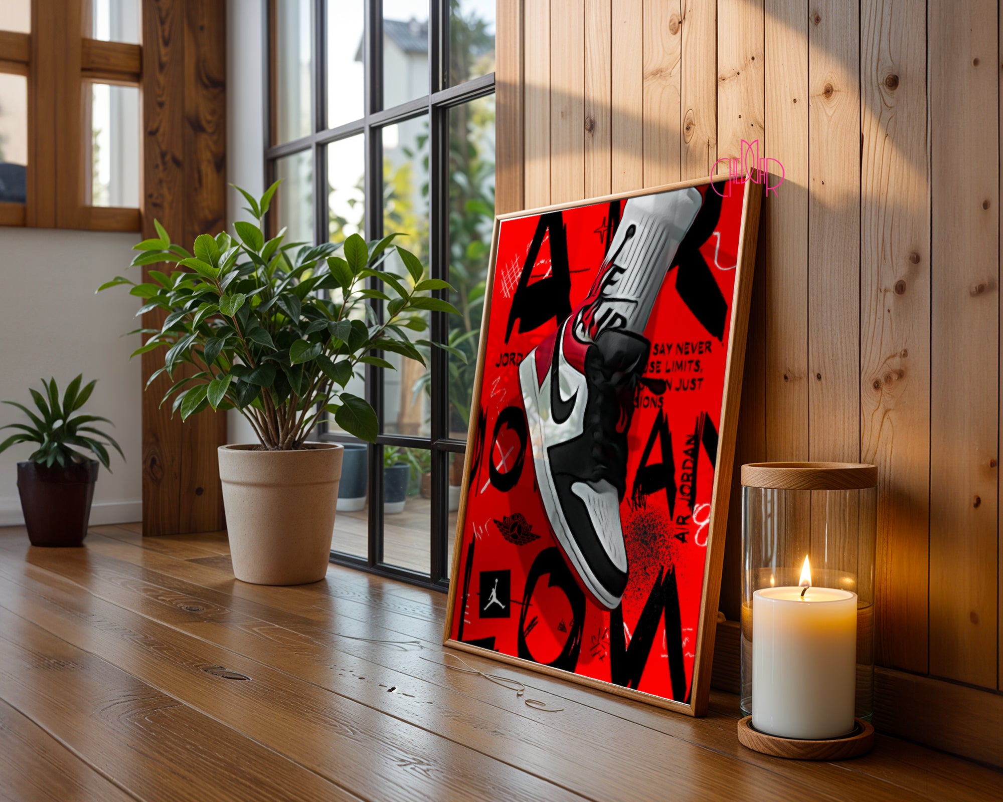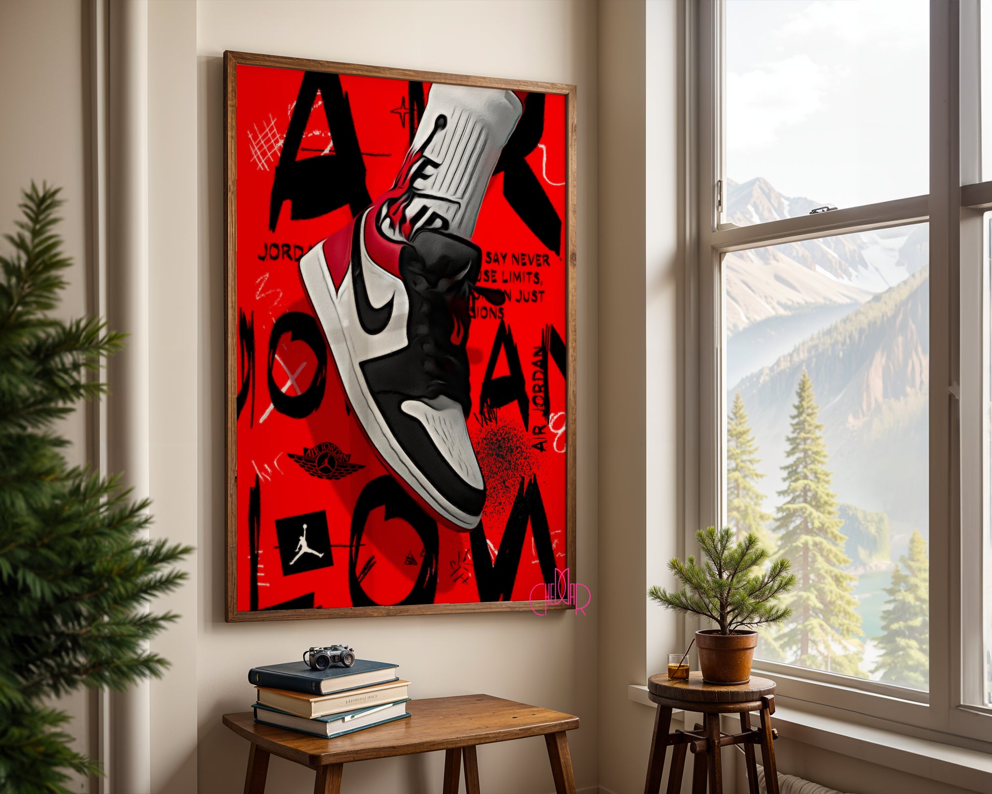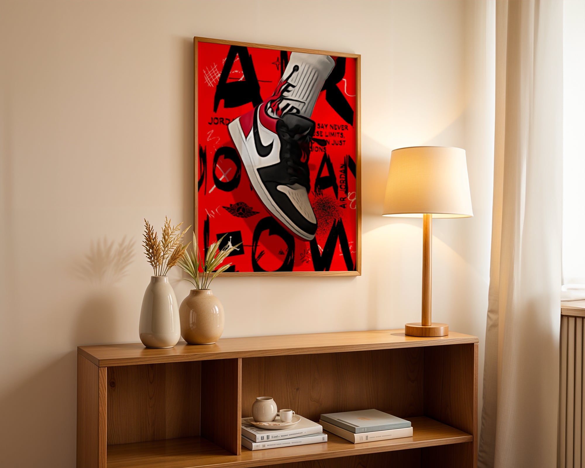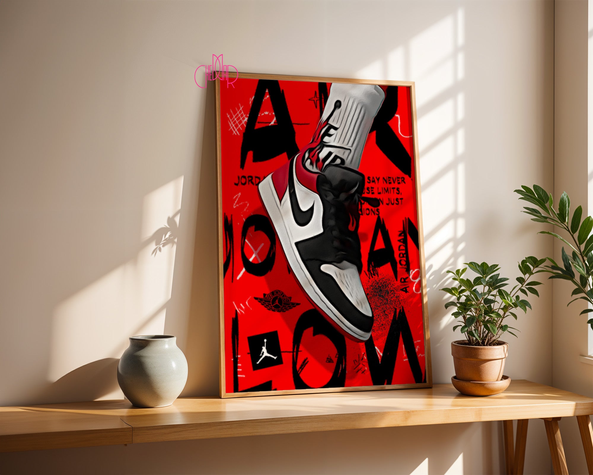 Minimalistyczna Typografia: U dołu plakatu znajduje się subtelny napis „AIR JORDAN - BLACK JESUS - HIS AIRNESS”, który w dyskretny sposób oddaje hołd legendarnym przydomkom mistrza.