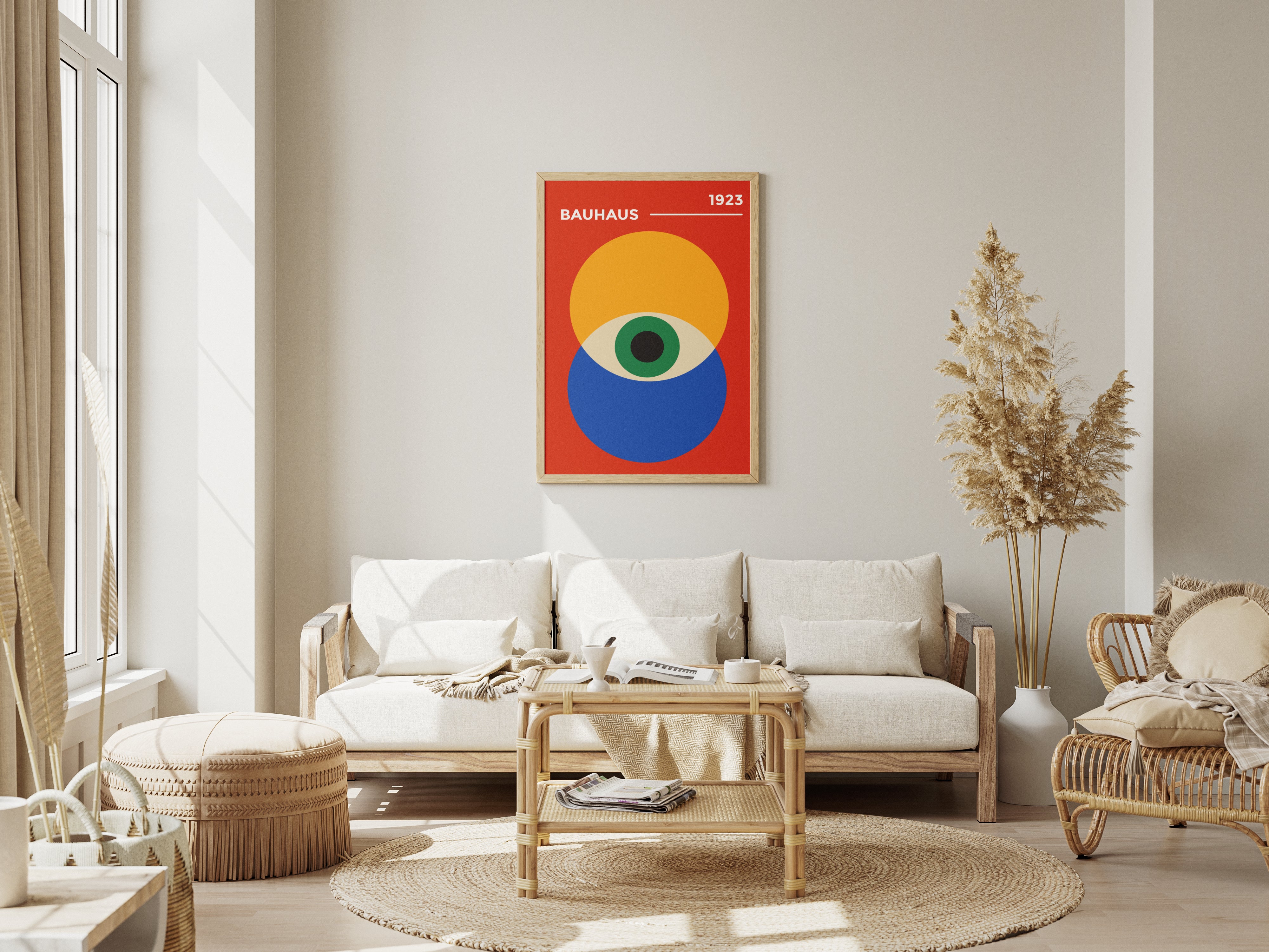 Szukasz wyjątkowej dekoracji, która doda Twojemu wnętrzu charakteru i stylu? Nasze plakaty inspirowane twórczością Bauhaus to idealny wybór! Wspaniały plakat przedstawiający oczy proroka w kolorze zielonym na pomarańczowym tle, inspirowane plakatem Bauhaus z 1923 roku.