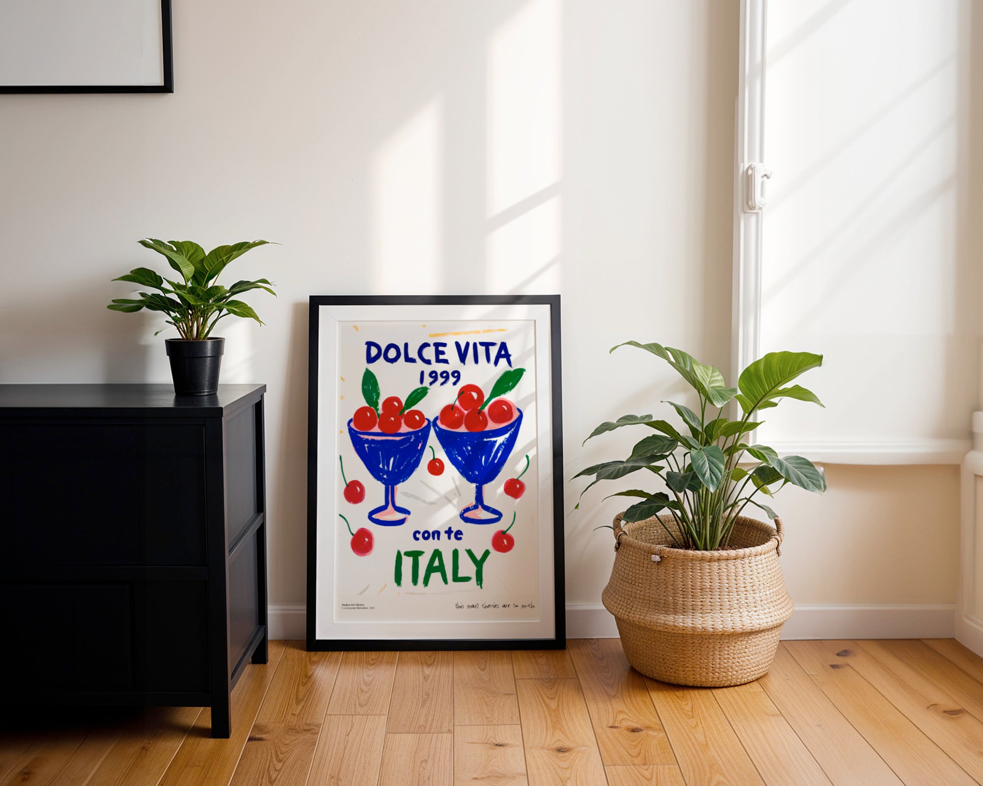 Utrzymany w estetyce „dopamine decor”, ten plakat wykorzystuje energetyczne kontrasty błękitu, czerwieni i zieleni na jasnym tle, aby natychmiast poprawić nastrój i ożywić każdą ścianę. Humorystyczny dopisek na dole: „this many cherries are too much” to mrugnięcie okiem do widza, przypominające, że w dobrym życiu nie ma czegoś takiego jak „zbyt wiele przyjemności”.