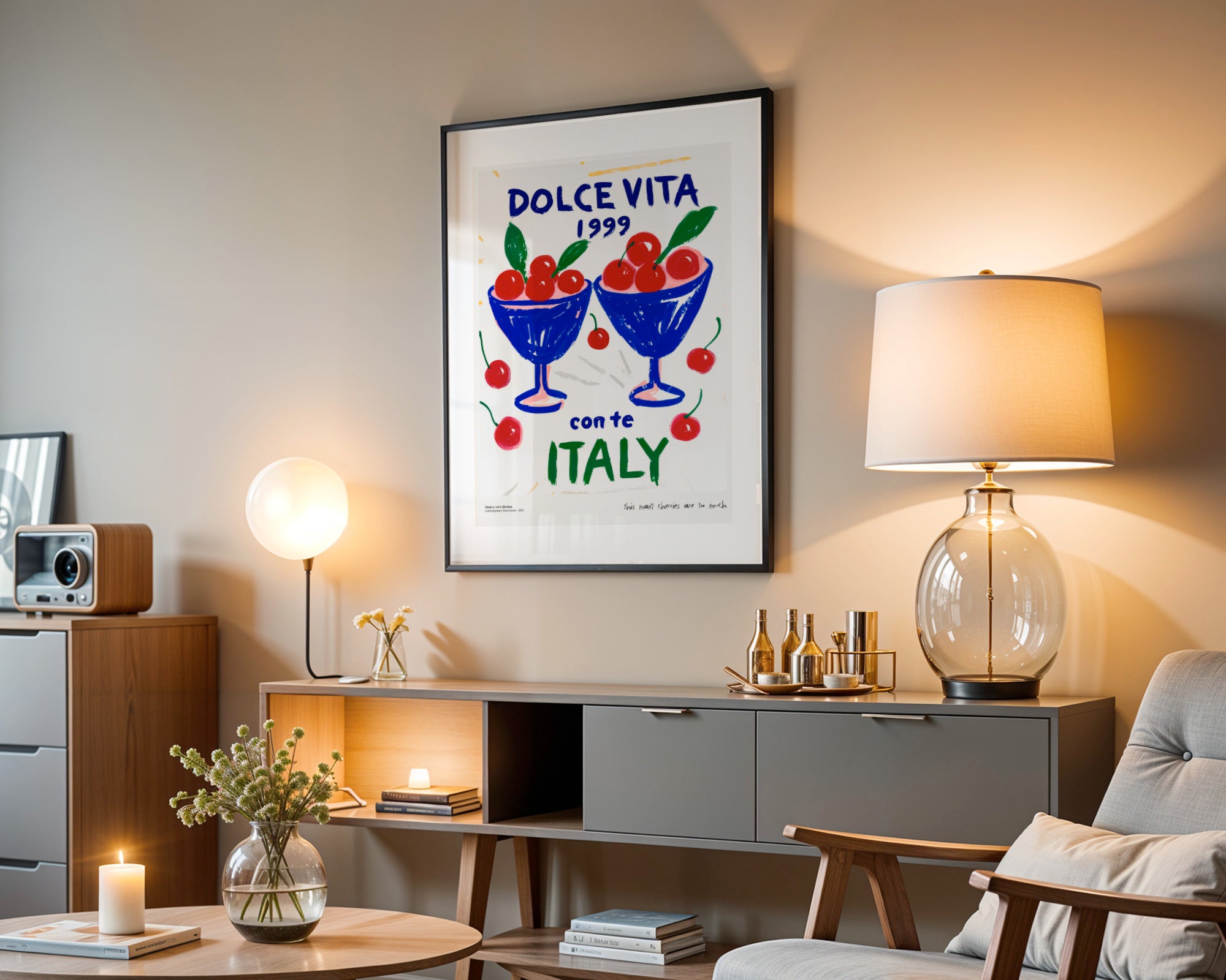 Przenieś się myślami do słonecznej Italii z 1999 roku! Ten wyjątkowy poster celebruje kultowe „słodkie życie” poprzez soczystą, artystyczną wizję. Przedstawia dwa eleganckie, błękitne pucharki wypełnione po brzegi jaskrawoczerwonymi czereśniami, otoczone dynamicznie rozrzuconymi owocami. Wyrazista typografia „DOLCE VITA 1999 con te ITALY” nadaje kompozycji nostalgicznego, a zarazem bardzo nowoczesnego charakteru.
