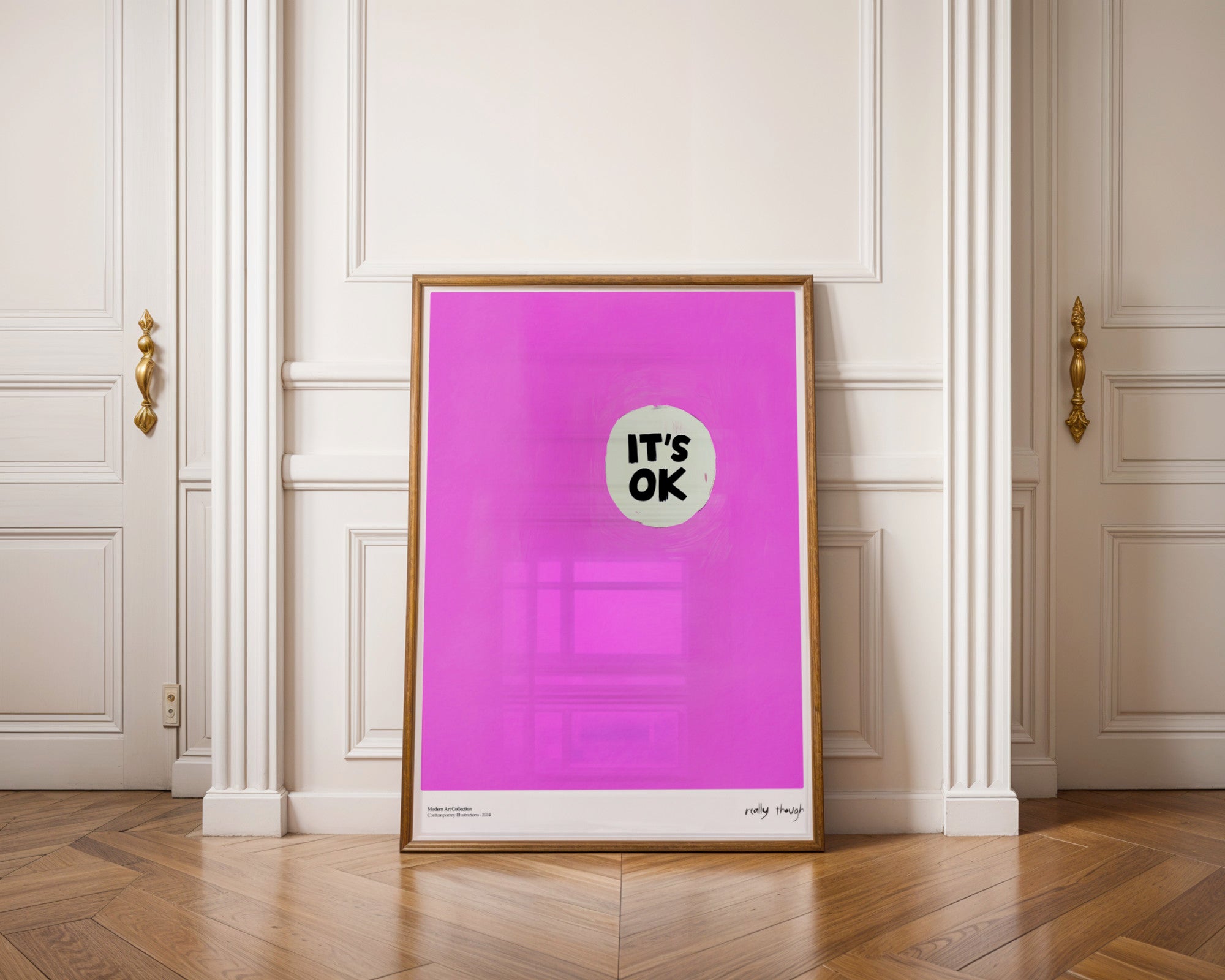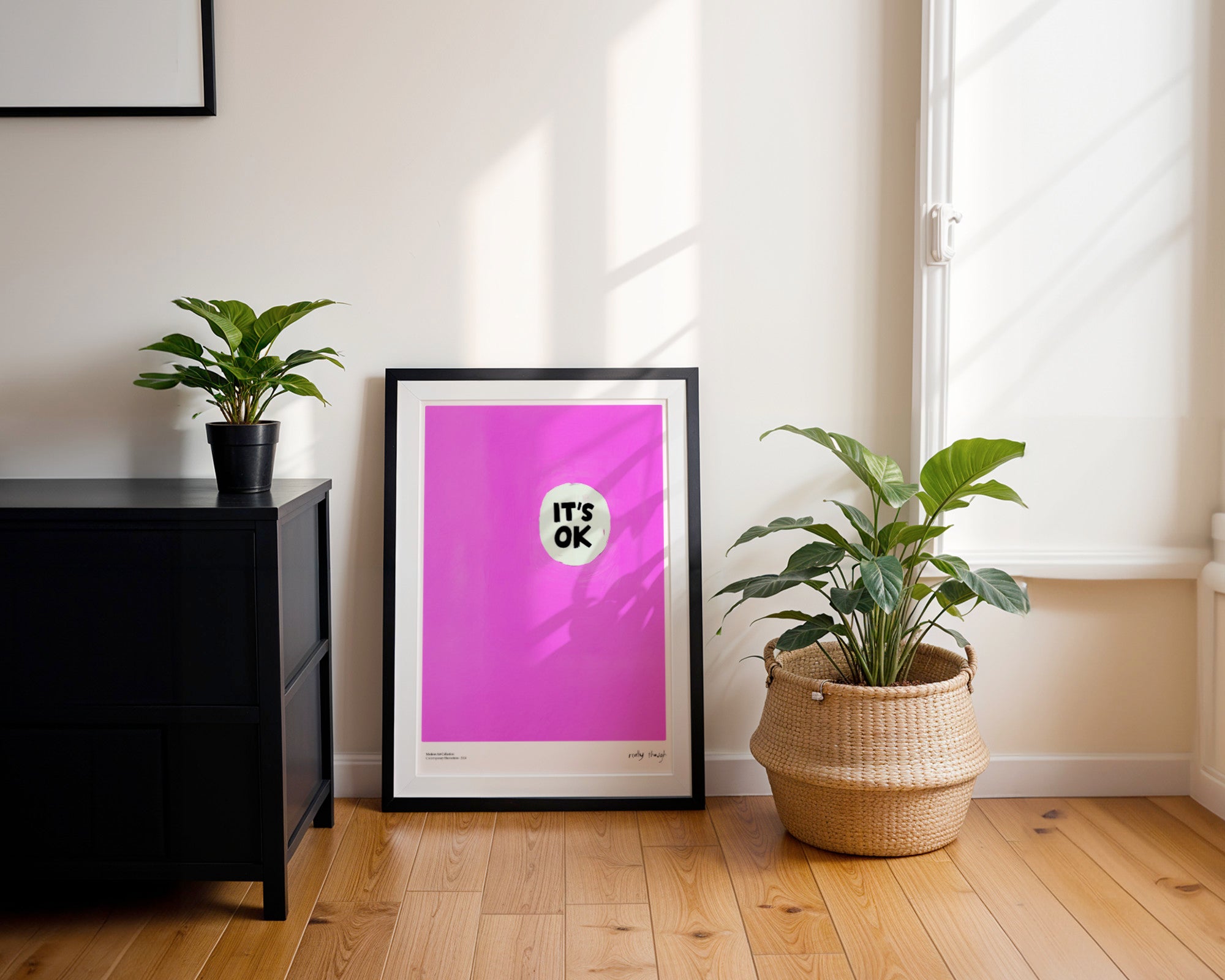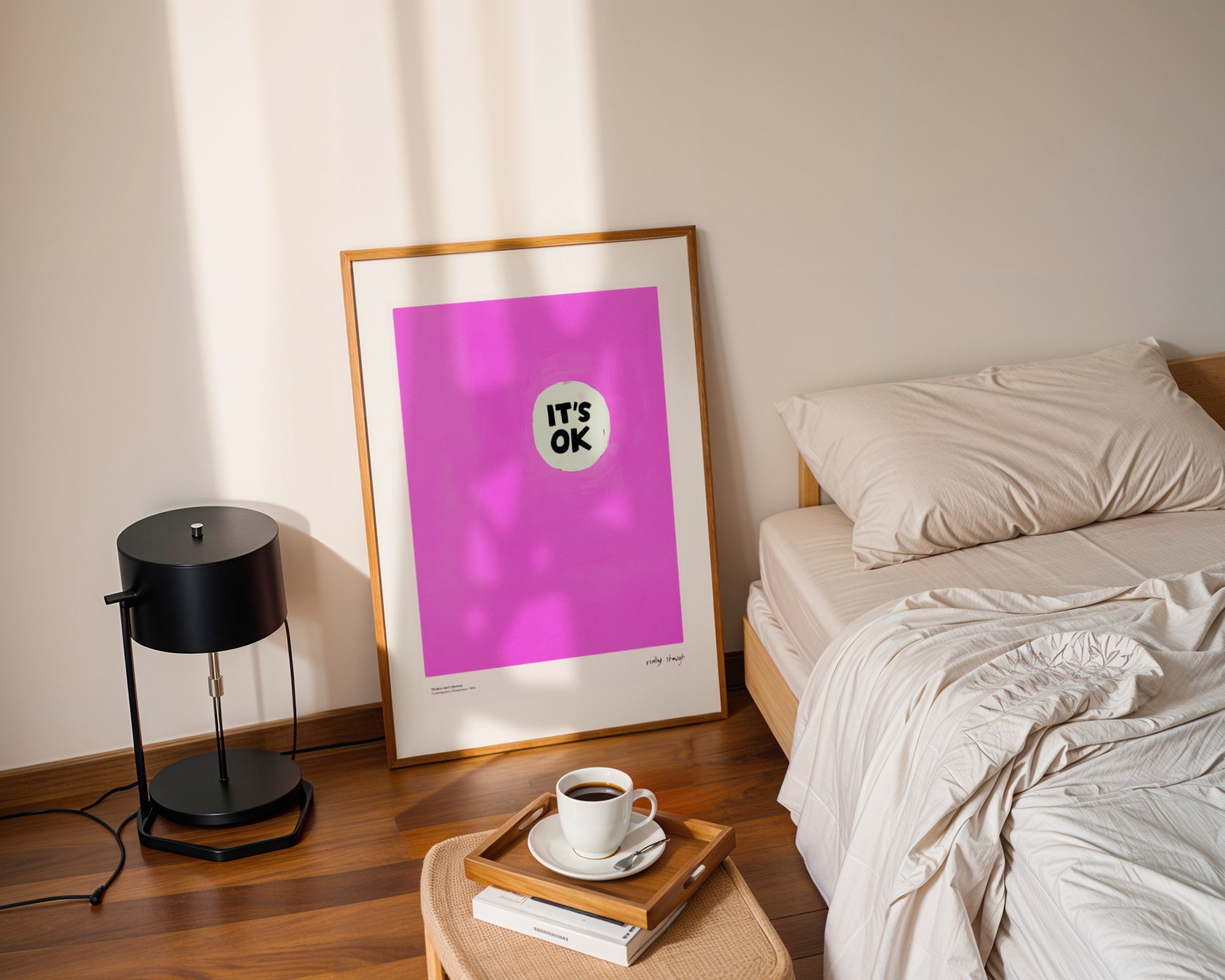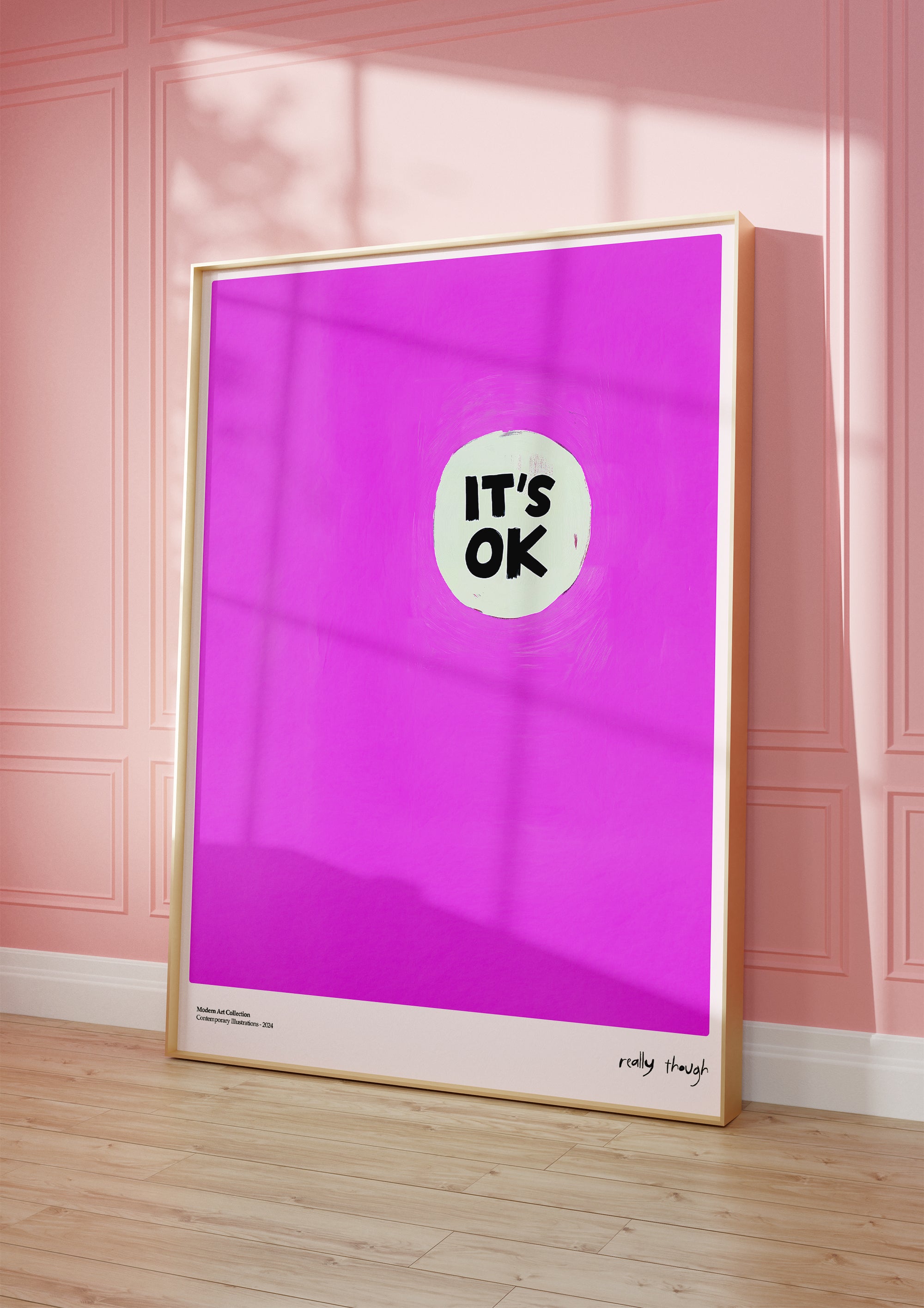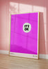 Czasem najprostsze słowa mają największą moc. Plakat „It’s OK” to nowoczesna, minimalistyczna kompozycja, która celebruje akceptację i wewnętrzny balans. Na głębokim, teksturalnym tle w kolorze intensywnej magenty umieszczono subtelny, jasny punkt z wymownym napisem. Ten poster to doskonały przykład sztuki współczesnej, która nie potrzebuje skomplikowanych form, by wywołać silne, pozytywne emocje.