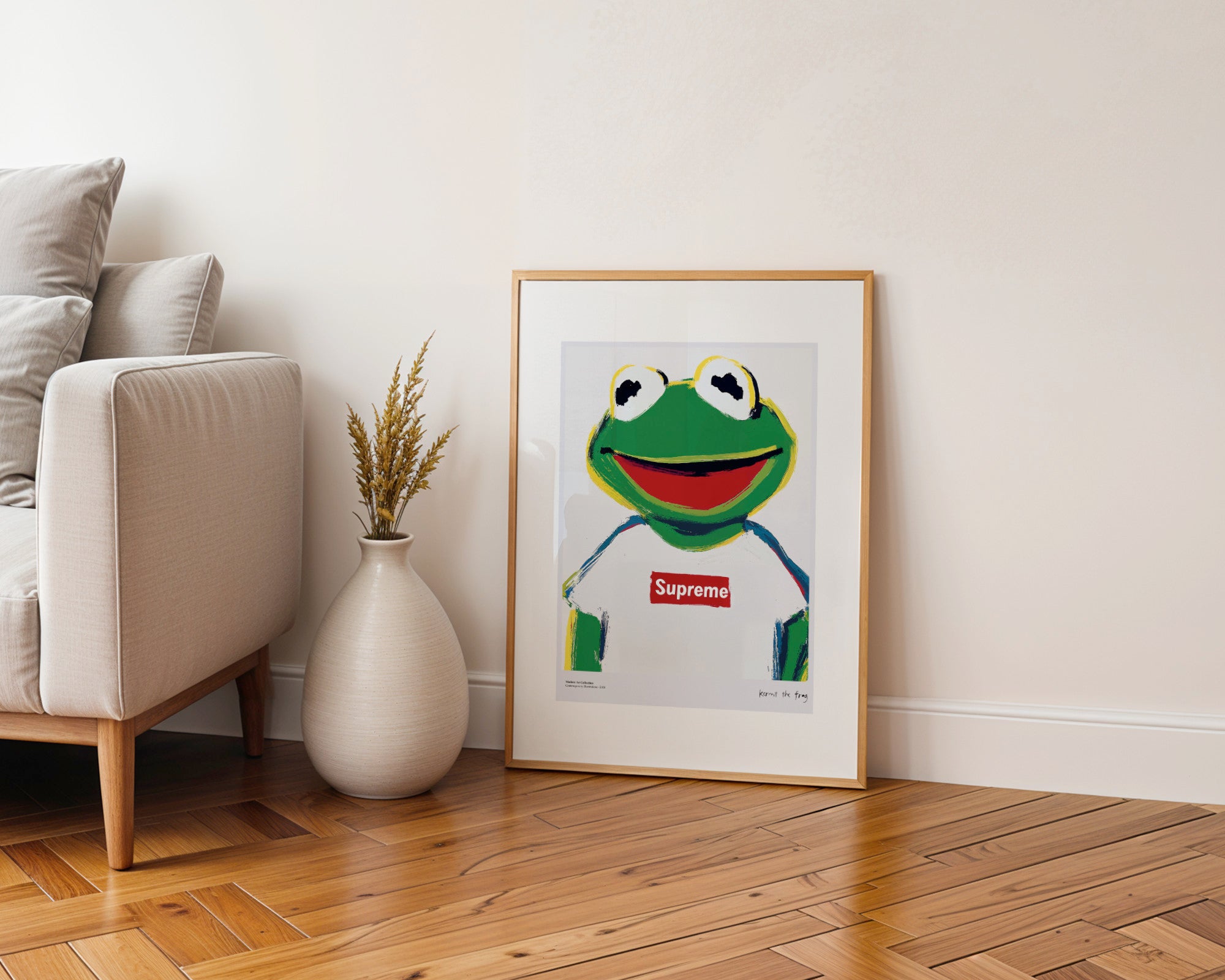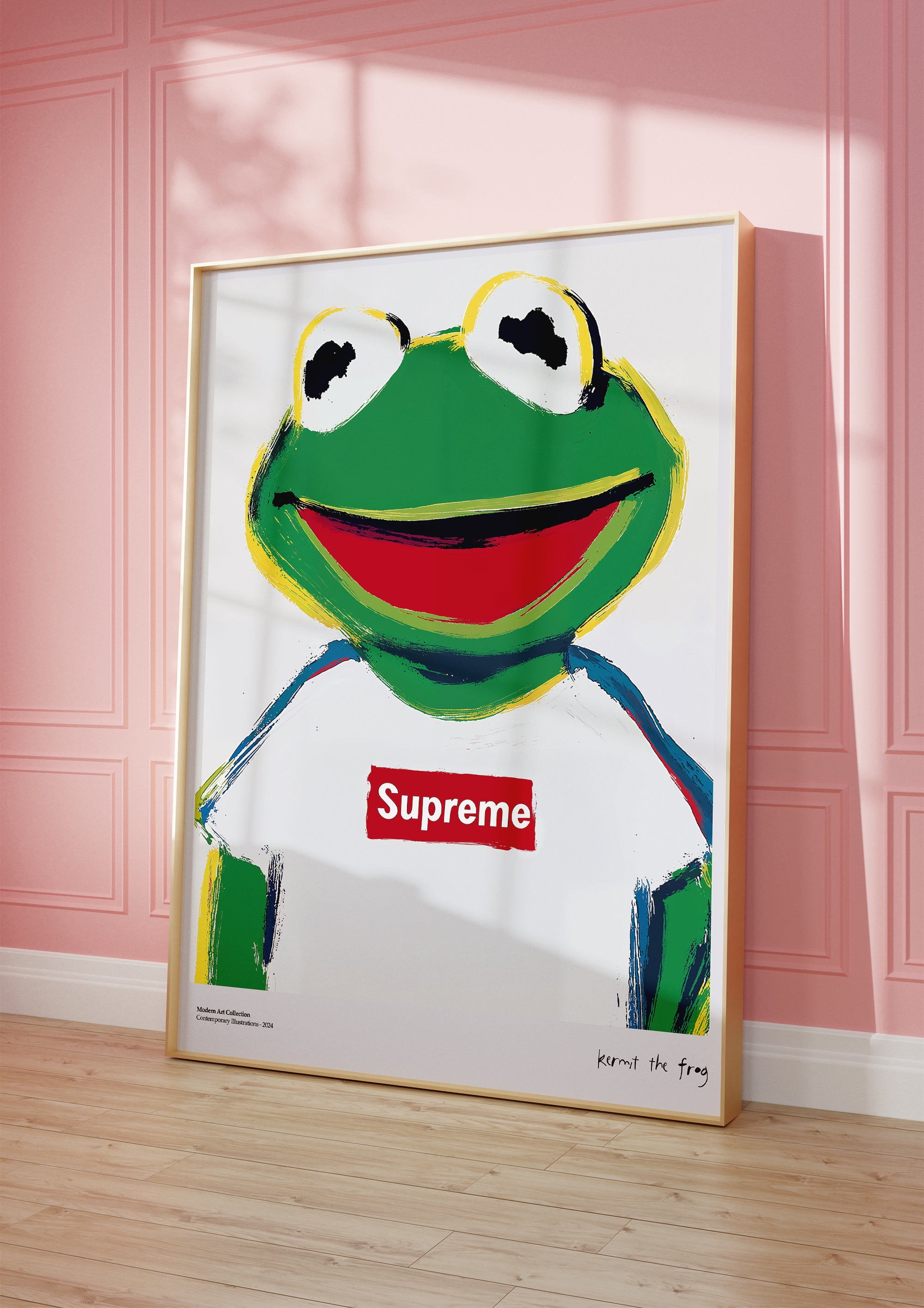 Wprowadź do swojego wnętrza dawkę humoru i miejskiego sznytu dzięki temu wyjątkowemu plakatowi! „Kermit the Frog” w kultowej koszulce z logo Supreme to doskonały przykład nowoczesnej sztuki, która bawi się symbolami luksusu i popkultury. Ten poster to hołd dla najsłynniejszej żaby świata, przedstawionej w surowym, malarskim stylu z wyraźnymi pociągnięciami pędzla, co nadaje mu unikalnego, artystycznego charakteru.
