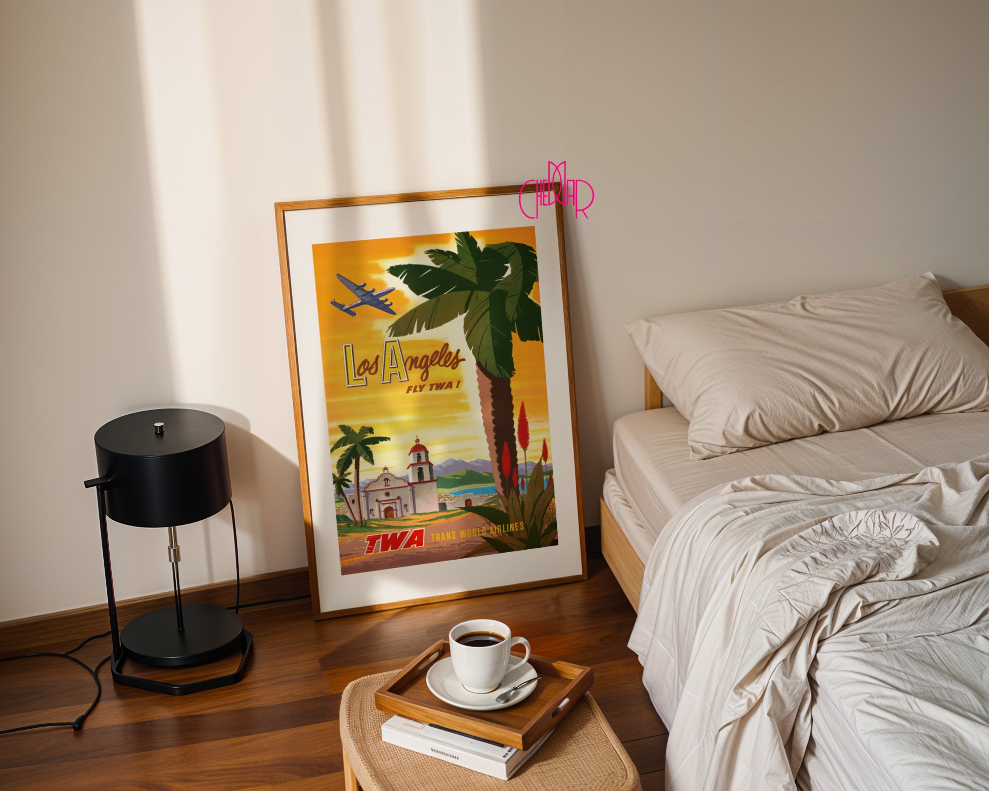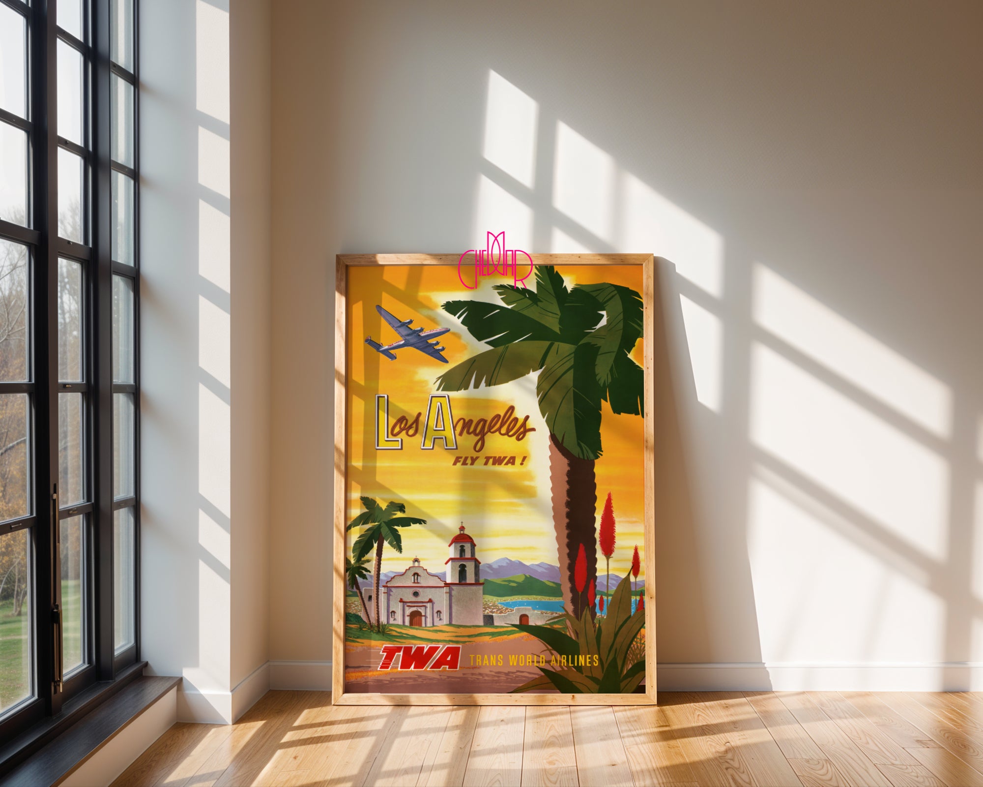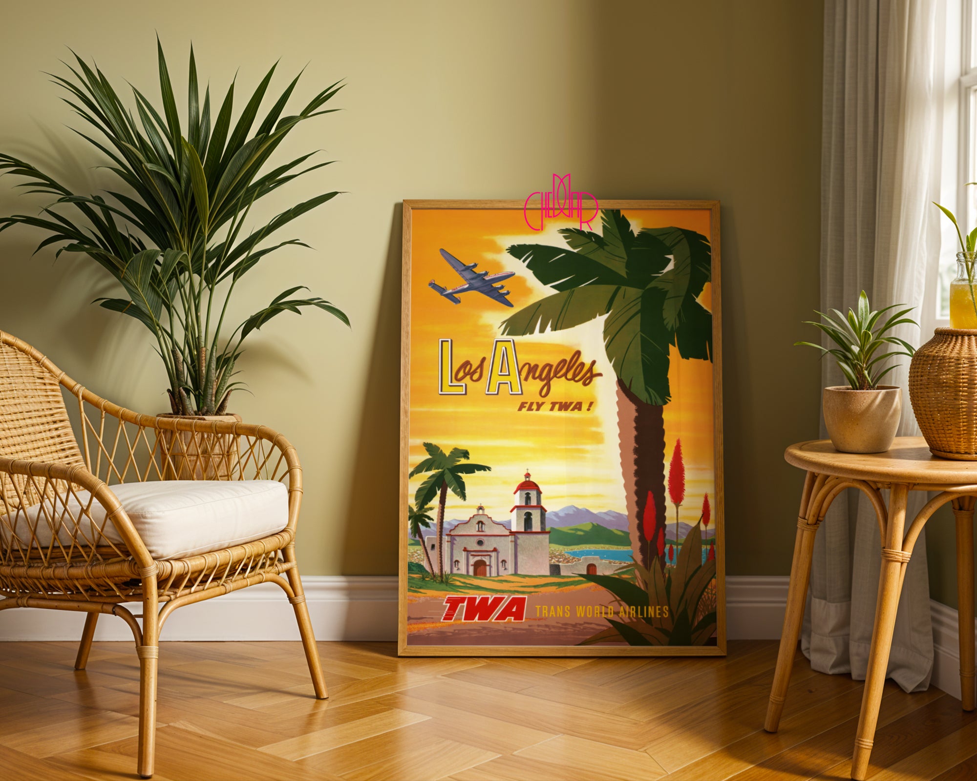Ten wyjątkowy plakat to nie tylko dekoracja – to wehikuł czasu, który przenosi Cię do lat 50., kiedy podróż samolotem była luksusem, a marzenie o Kalifornii żywe jak nigdy. Na pierwszym planie: monumentalne palmy, kolorowe rośliny tropikalne i urokliwa hiszpańska misja – symbol południowej Kalifornii. W tle – majestatyczne góry, lazurowe niebo i ikoniczny samolot linii TWA, unoszący się nad zachodem słońca.