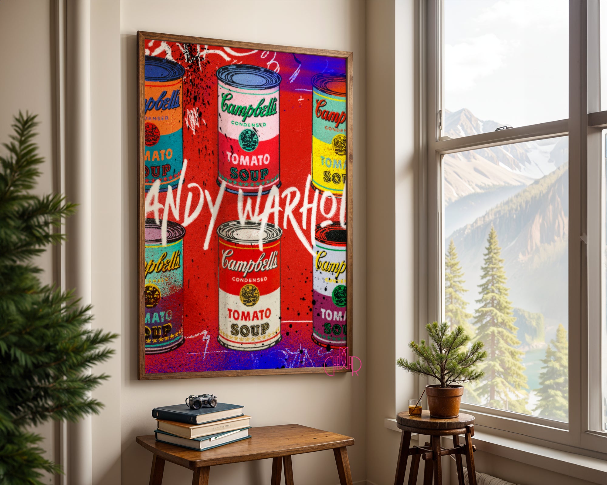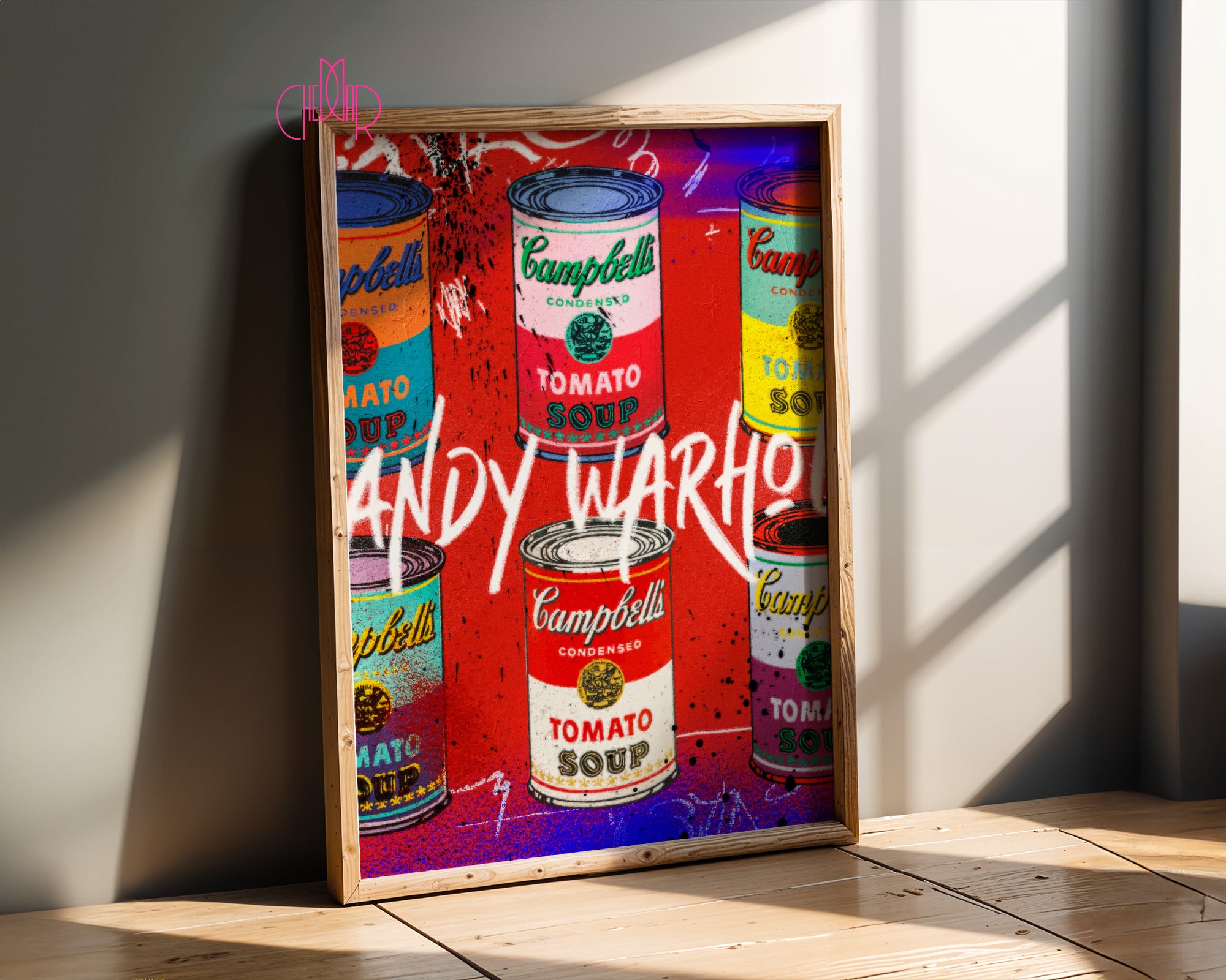 Sztuka masowa w nowym świetle Projekt prezentuje sześć puszek zupy Campbell’s ułożonych w dwóch rzędach, co nawiązuje do słynnych wystaw Warhola z lat 60. Jednak w tej wersji każda puszka ma unikalną, nasyconą paletę barw – od klasycznej czerwieni, przez turkus i zieleń, aż po fiolet. Całość została „zbombardowana” elementami graffiti: białymi bazgrołami, czarnymi kropkami sprayu i neonowymi zaciekami, co nadaje pracy surowego, galeryjnego sznytu.