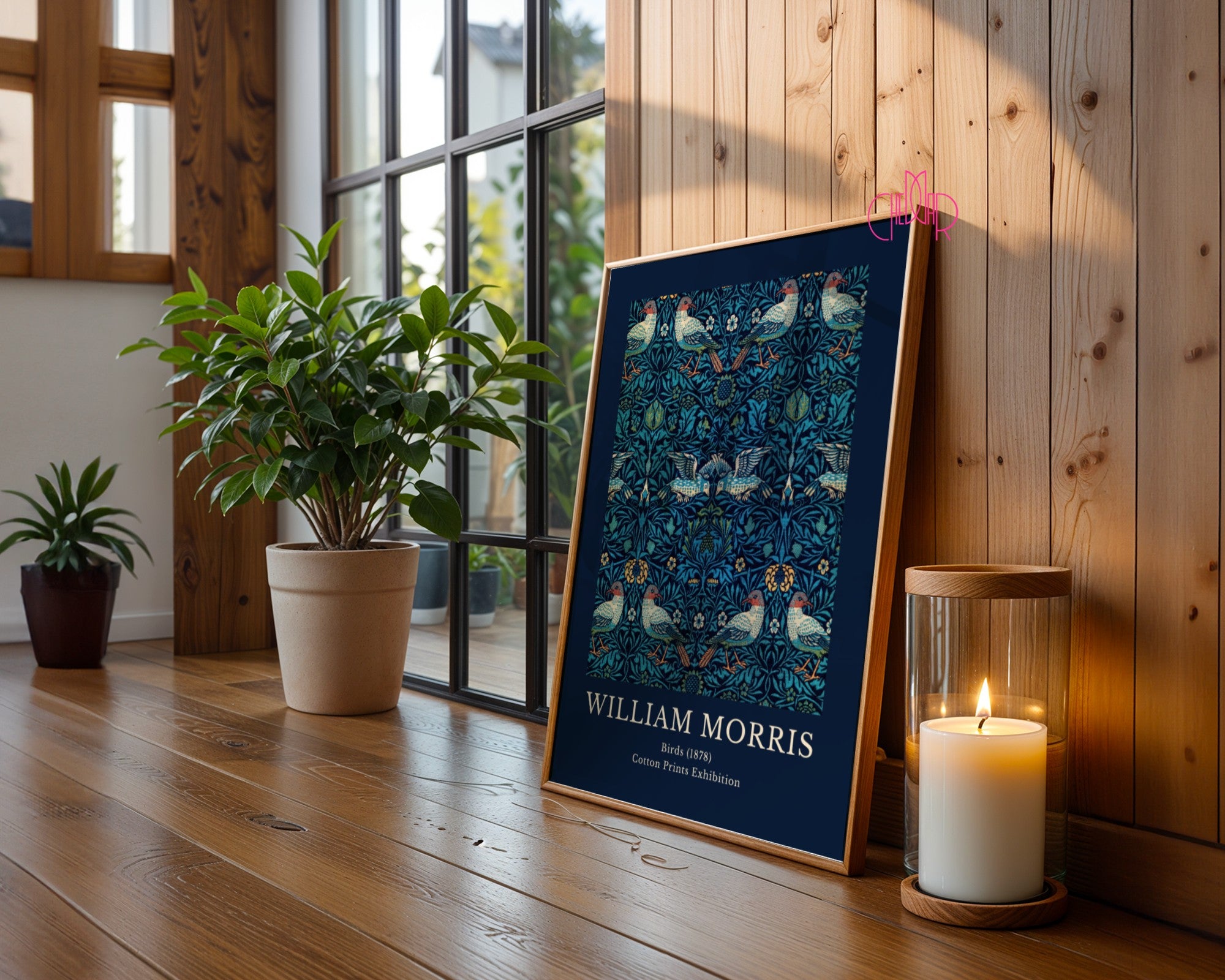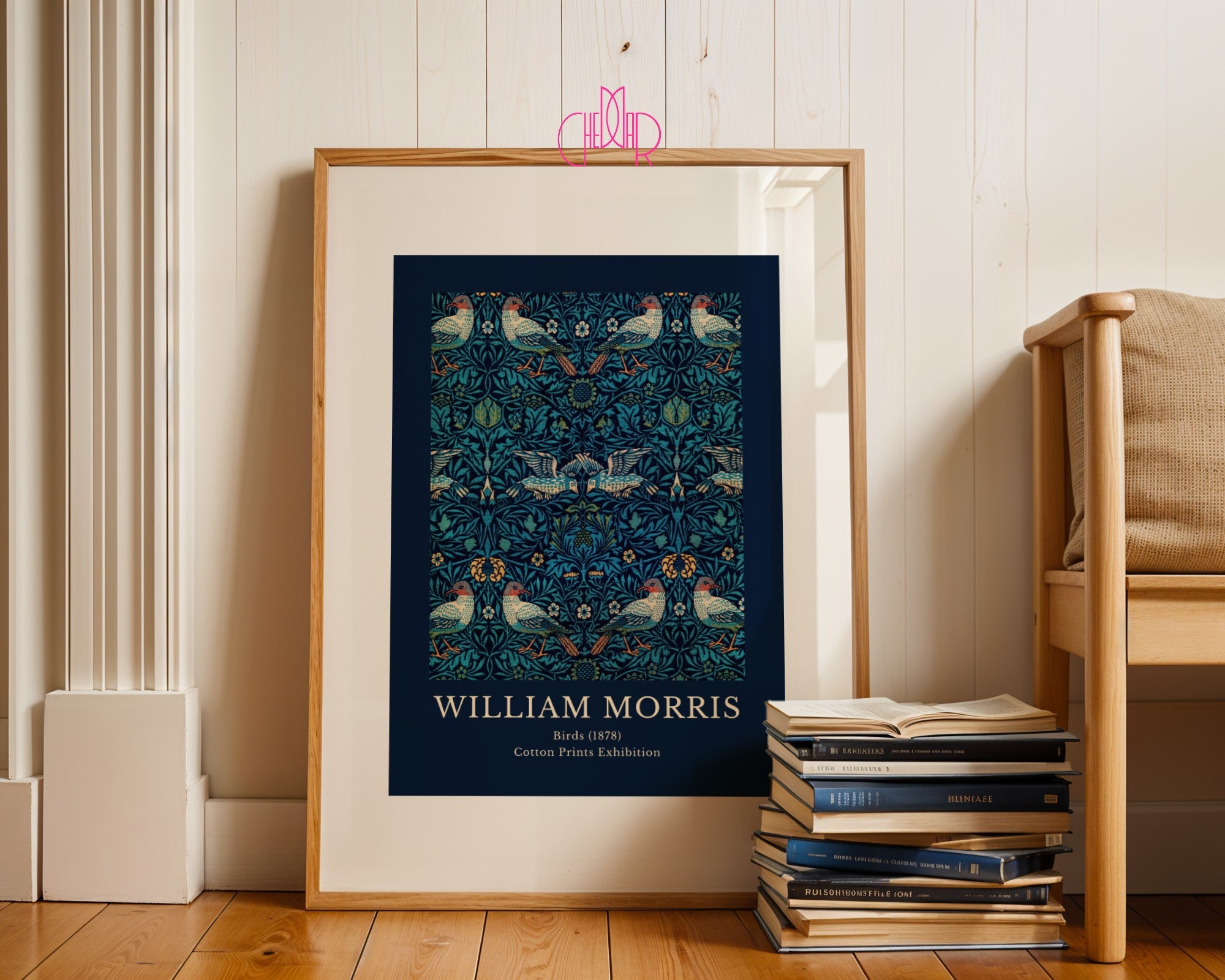 Dodaj elegancji i ponadczasowego stylu do swojego wnętrza dzięki plakatowi inspirowanemu Williamem Morrisem – „Cotton Print Exhibition Birds” (1878) na granatowym tle. Motywy ptaków, kwiatów i liści wprowadzają spokój, harmonię i wyjątkowy charakter, łącząc klasyczne wzornictwo z nowoczesnym designem.