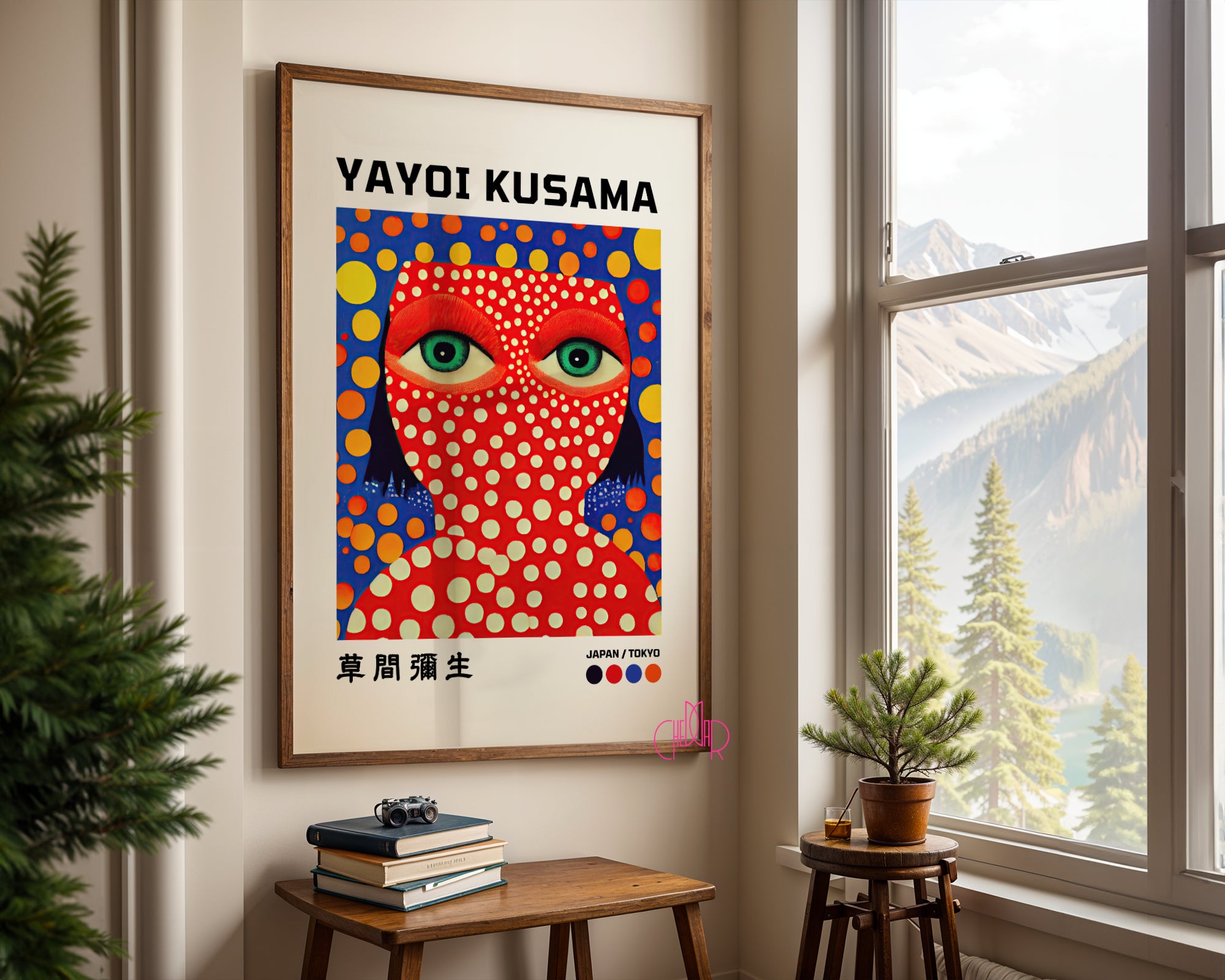 Zanurz się w nieskończoności kropek królowej awangardy Odkryj fascynujący świat Yayoi Kusamy dzięki temu wyrazistemu plakatowi, który jest hołdem dla japońskiej mistrzyni współczesnego surrealizmu. Grafika przedstawia charakterystyczny autoportret artystki, zdominowany przez jej ikoniczny motyw „polka dots”. Intensywna czerwień twarzy pokrytej białymi kropkami kontrastuje z głębokim błękitem tła i hipnotyzującymi, zielonymi oczami, które zdają się obserwować widza z każdego zakątka pomieszczenia. To kompozycja, która zaciera granice między rzeczywistością a halucynacją, wprowadzając do wnętrza energię tokyjskiej awangardy.